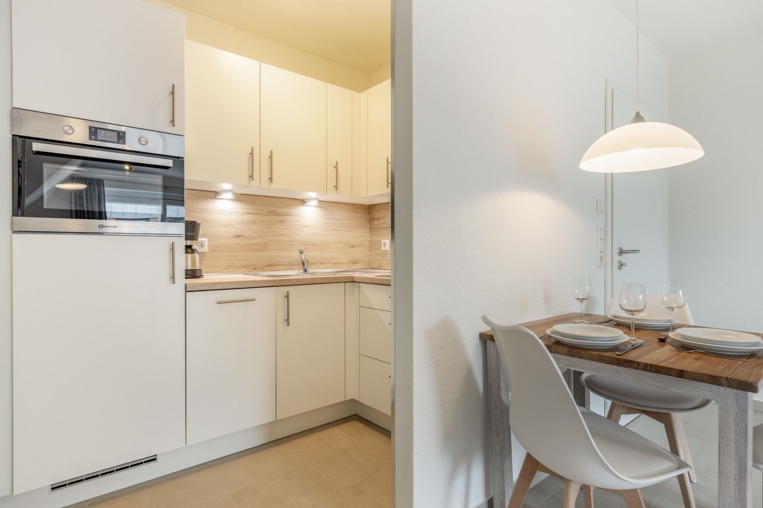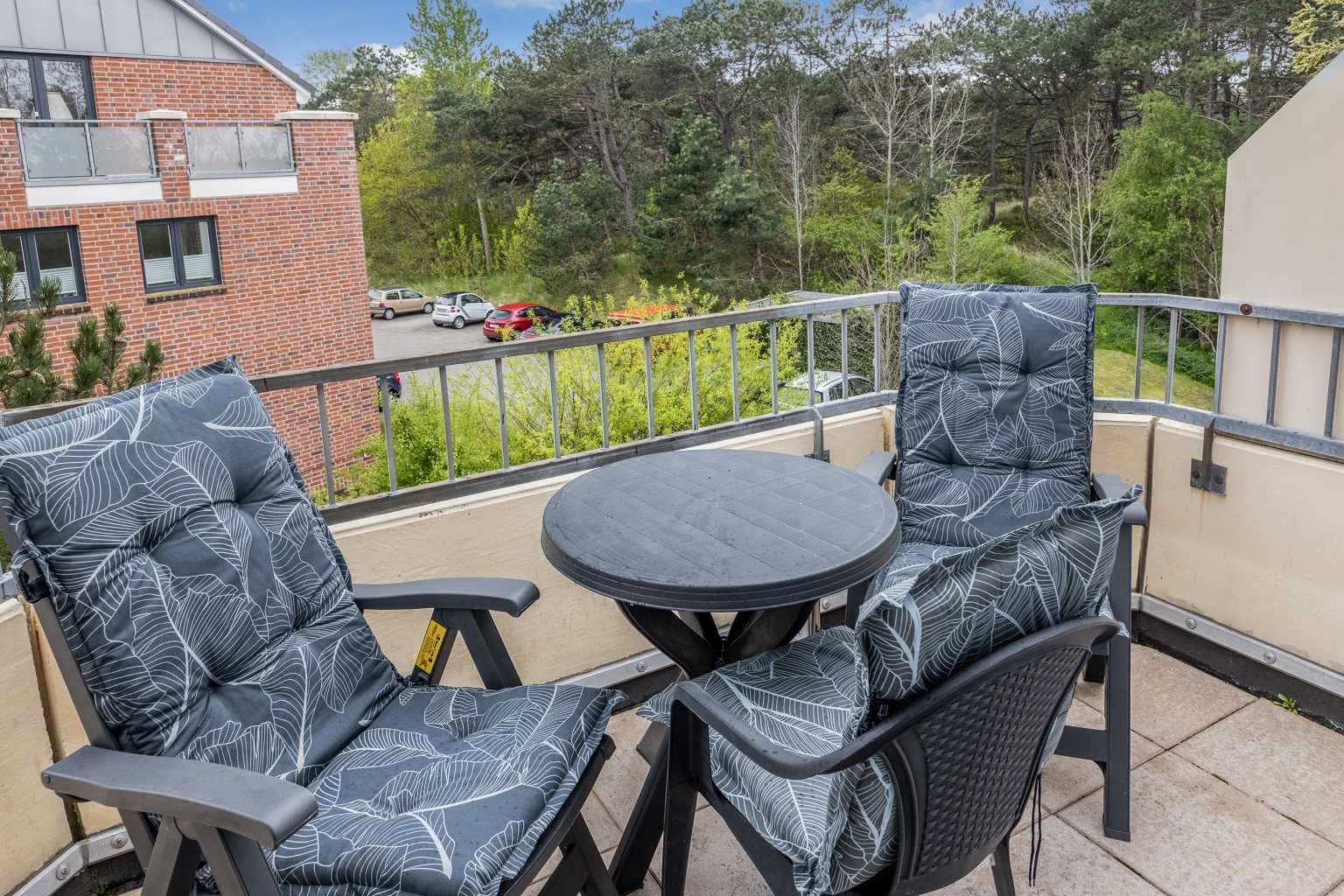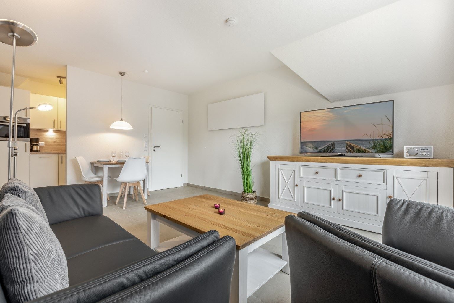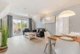 Wohnzimmer mit Sofa (2er), 1 Sessel, großes SMART-TV (Kabel) und Esstisch mit 3 Stühlen. Direkter Zugang zum möblierten Balkon nach Südwesten. Halboffene Küche mit Kombibackofen mit Mikrowelle, Kühlschrank mit Gefrierfach und Geschirrspüler.