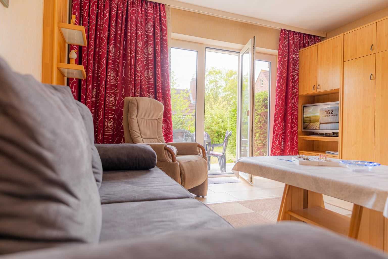 Wohnzimmer mit Sofa, Sessel, TV (Sat), ausklappbarem Schrank-Doppelbett (2x 80x200cm) und Esstisch mit 4 Stühlen. Direkter Zugang zur möblierten Gartenterrasse nach Süden. Kleine halboffene Küche mit Backofen, Mikrowelle, Geschirrspüler und Kühlschrank mit Gefrierfach.