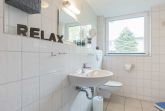 Badezimmer (Duschbad) mit Dusche, WC, Handtuchwärmer, Föhn und Tageslicht.