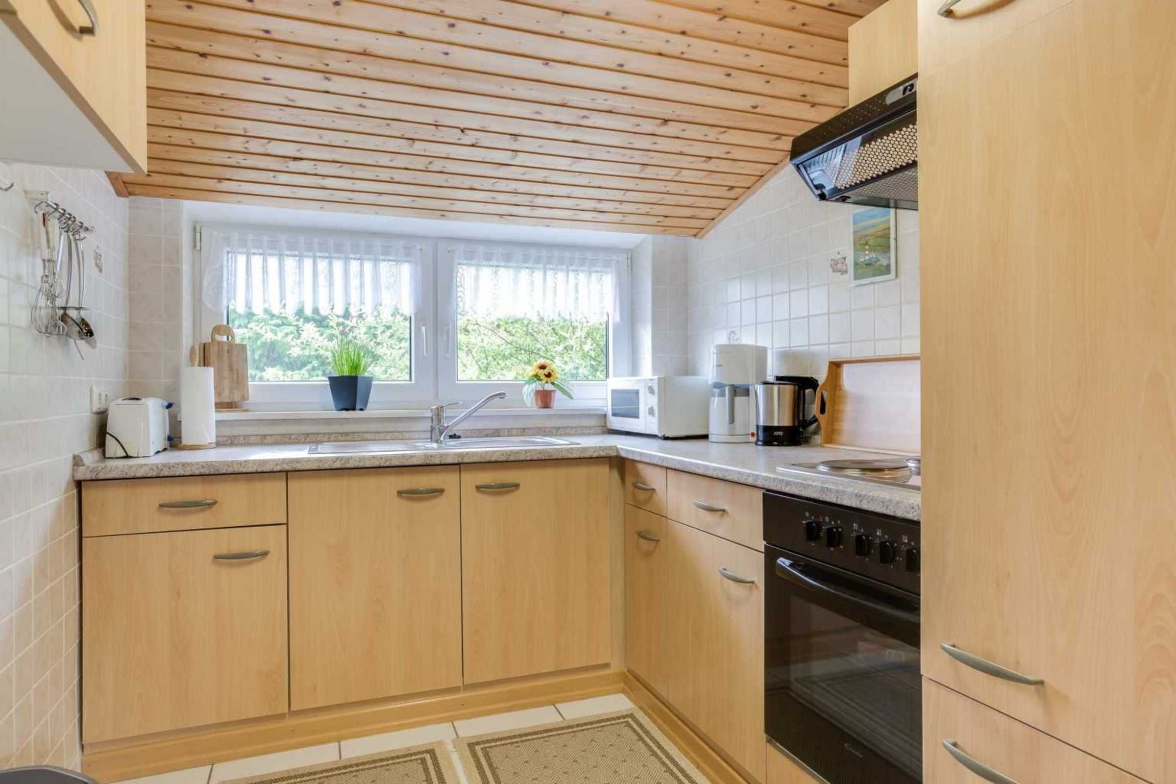 Halboffene Küche mit Backofen, Mikrowelle, Kühlschrank mit Gefrierfach und einigem Komfort.