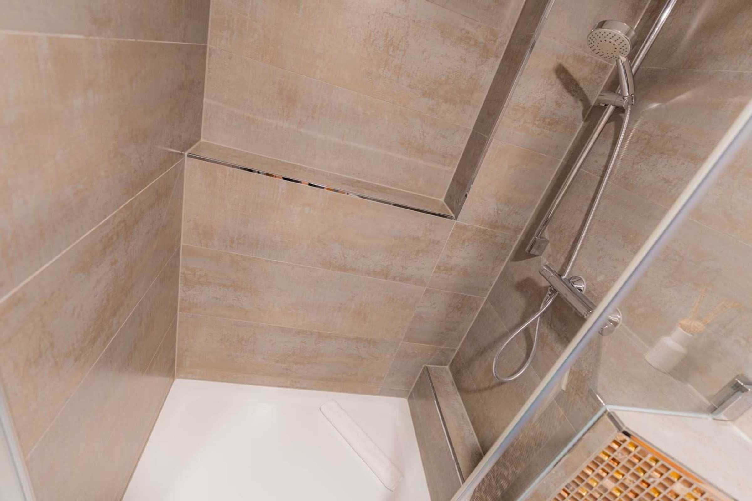 Badezimmer (Duschbad) mit Dusche, WC, Handtuchwärmer und Föhn.