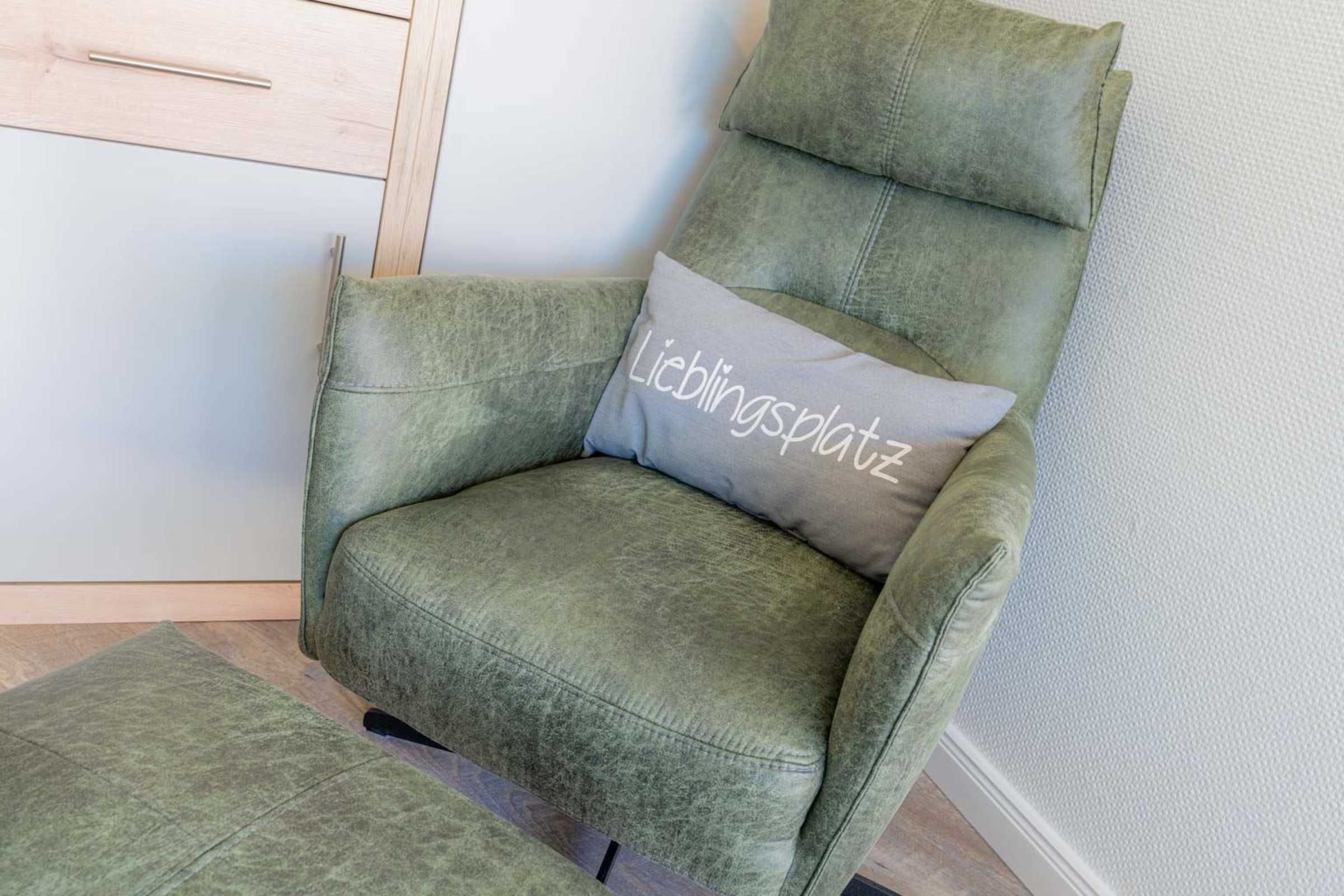 Wohnzimmer mit ausklappbarem (Schlaf-) Sofa (160x195cm), Sessel, TV (Kabel), Bluetooth-Soundsystem und Esstisch mit 4 Stühlen. Direkter Zugang zum möblierten 1. Balkon nach Westen.