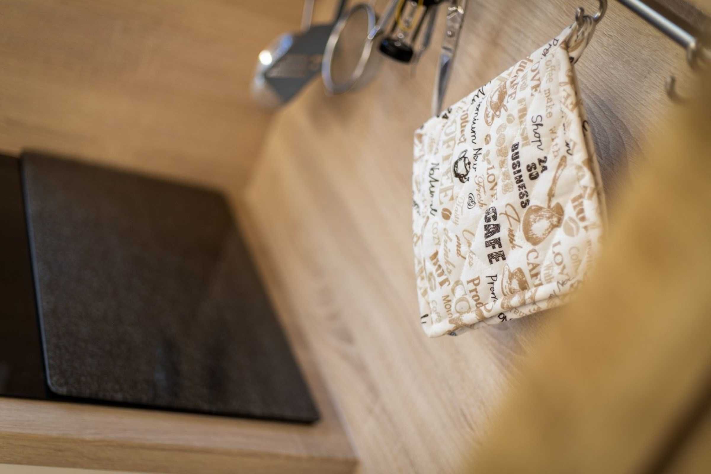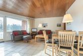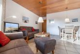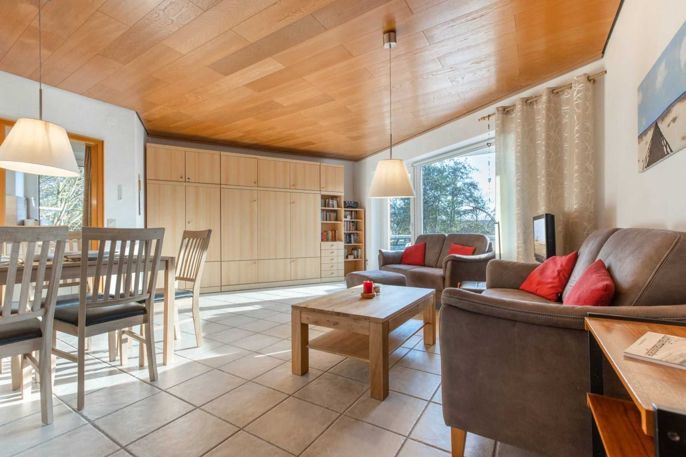 Wohnzimmer mit 2 Sofas (je für 2 Personen), ausklappbarem Schrank-Doppelbett (2x 80x200cm), TV (Kabel), Radio und Esstisch mit 5 Stühlen. Direkter Zugang zum möblierten Balkon nach Süden. Halboffene Küche mit Induktionsherd, Mikrowelle, Geschirrspüler und Kühlschrank mit Gefrierfach.