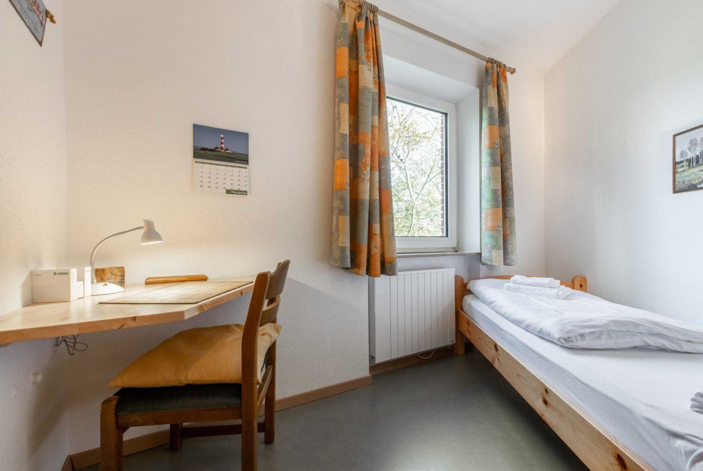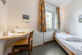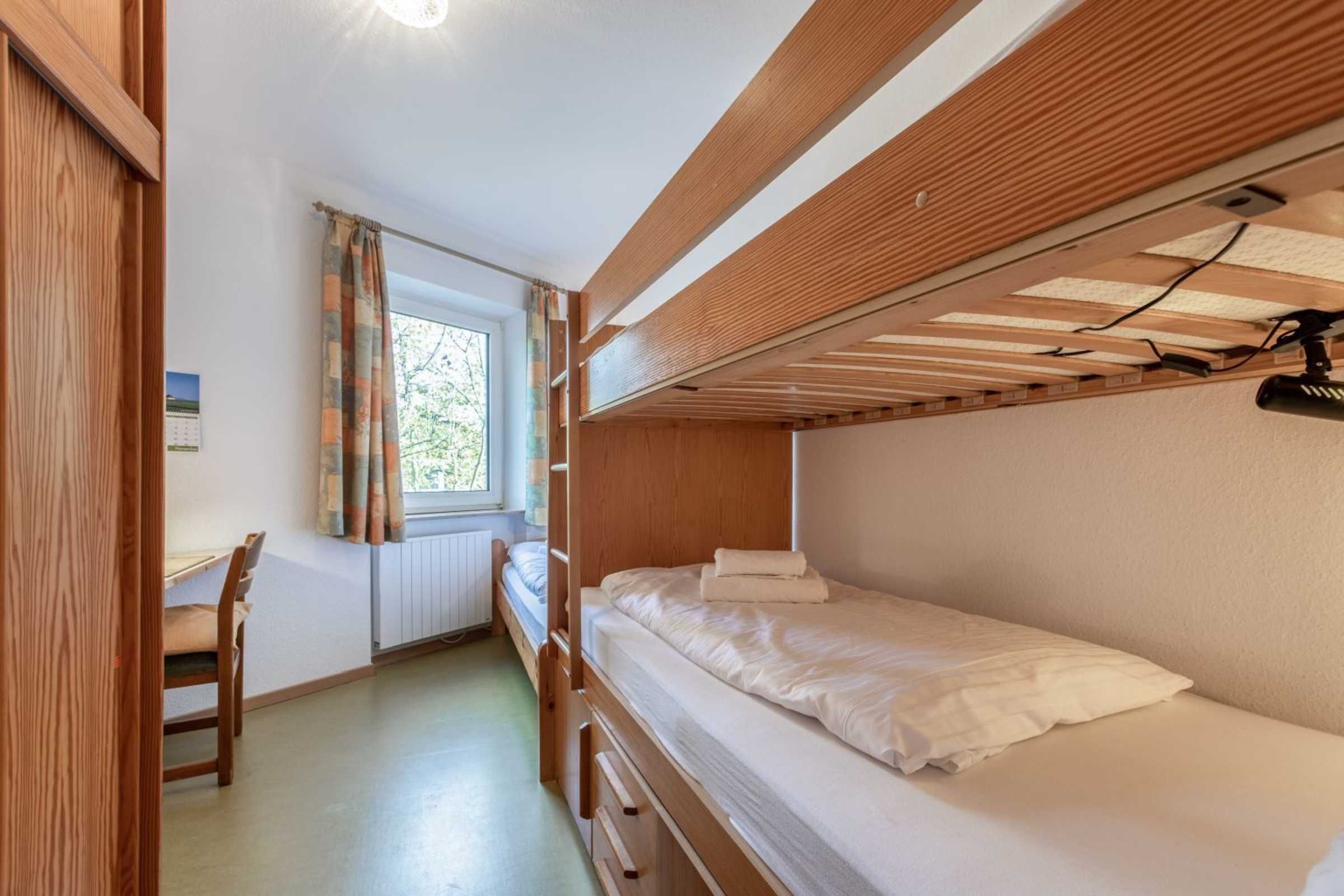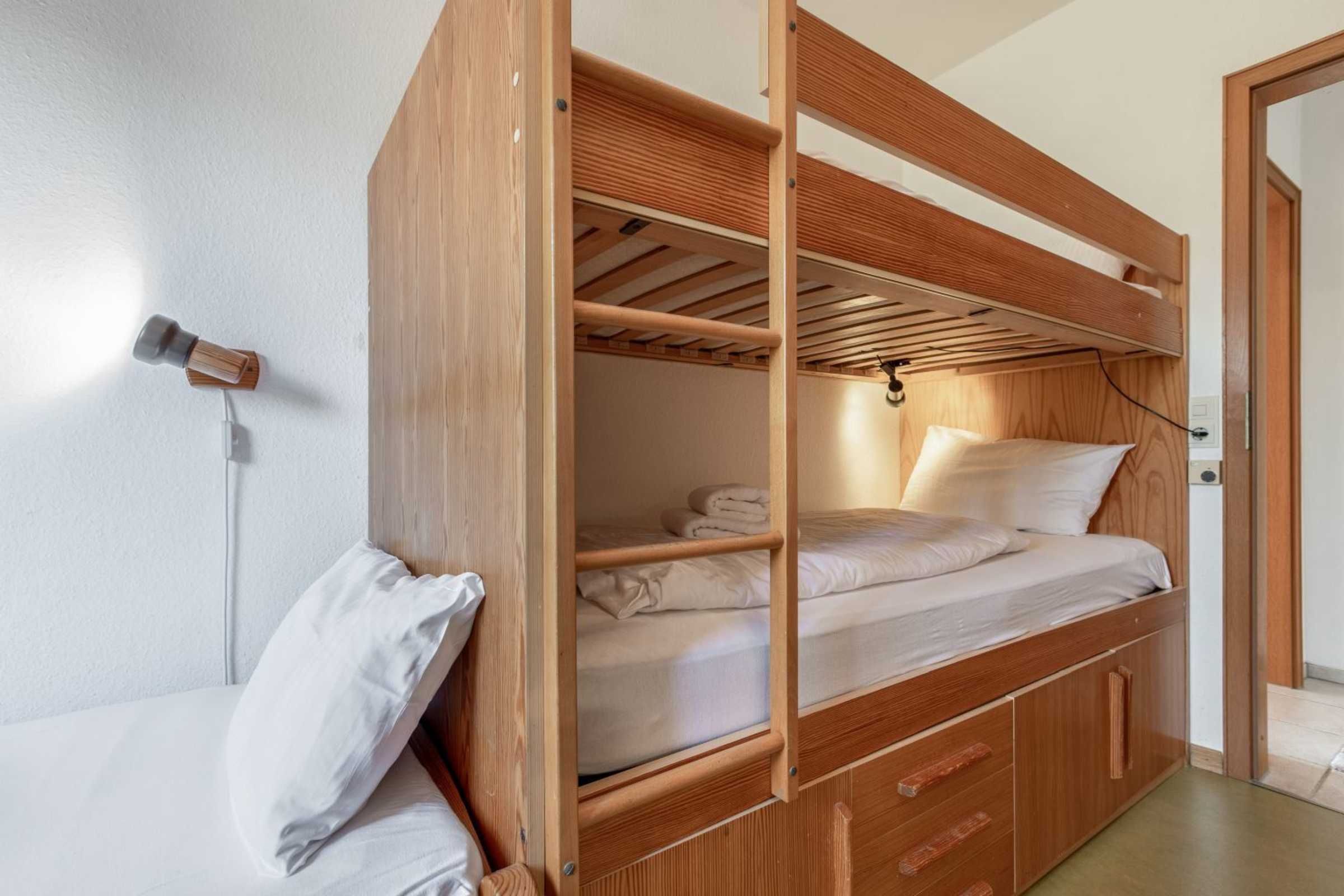 Schlafzimmer mit Einzelbett (90x190cm) und 2 Etagen-Einzelbetten (je 90x200cm), Kleiderschrank und Stuhl.