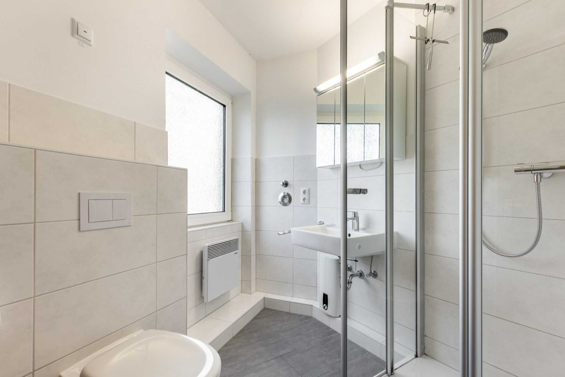 Modernes Badezimmer (Duschbad) mit Dusche, WC, Föhn und Tageslicht. Haushaltsschrank mit Staubsauger.
