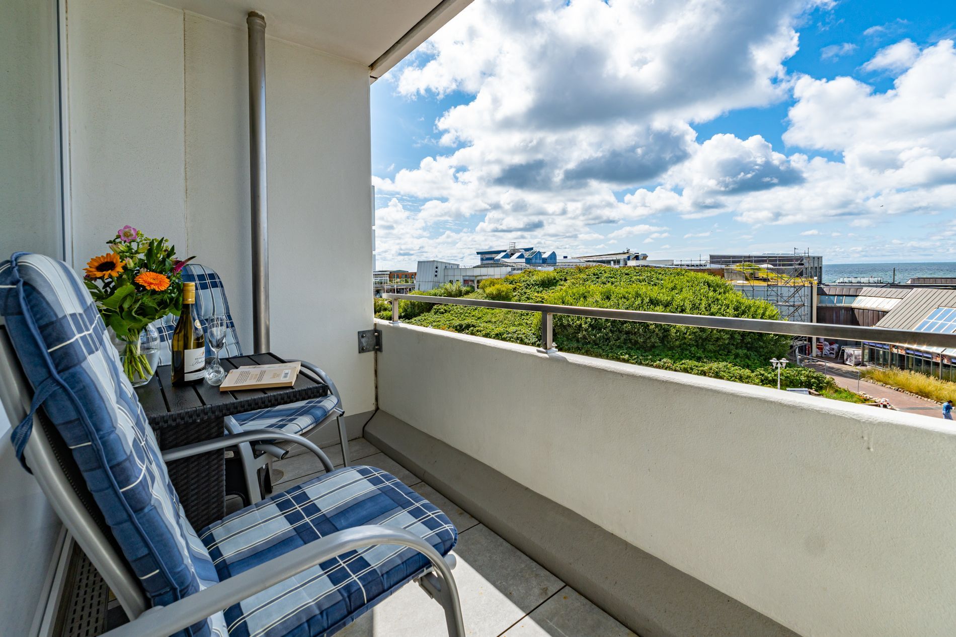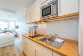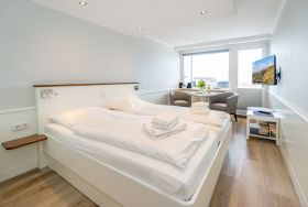 1-Zimmer-Nichtraucher-Ferienwohnung (ca. 25 qm) in der 3. Etage mit Meerblick zur Seeseite mit Westloggia (Nachmittagssonne, mit Balkonmöbeln und Auflagen) ideal geeignet für 1-2 Personen.