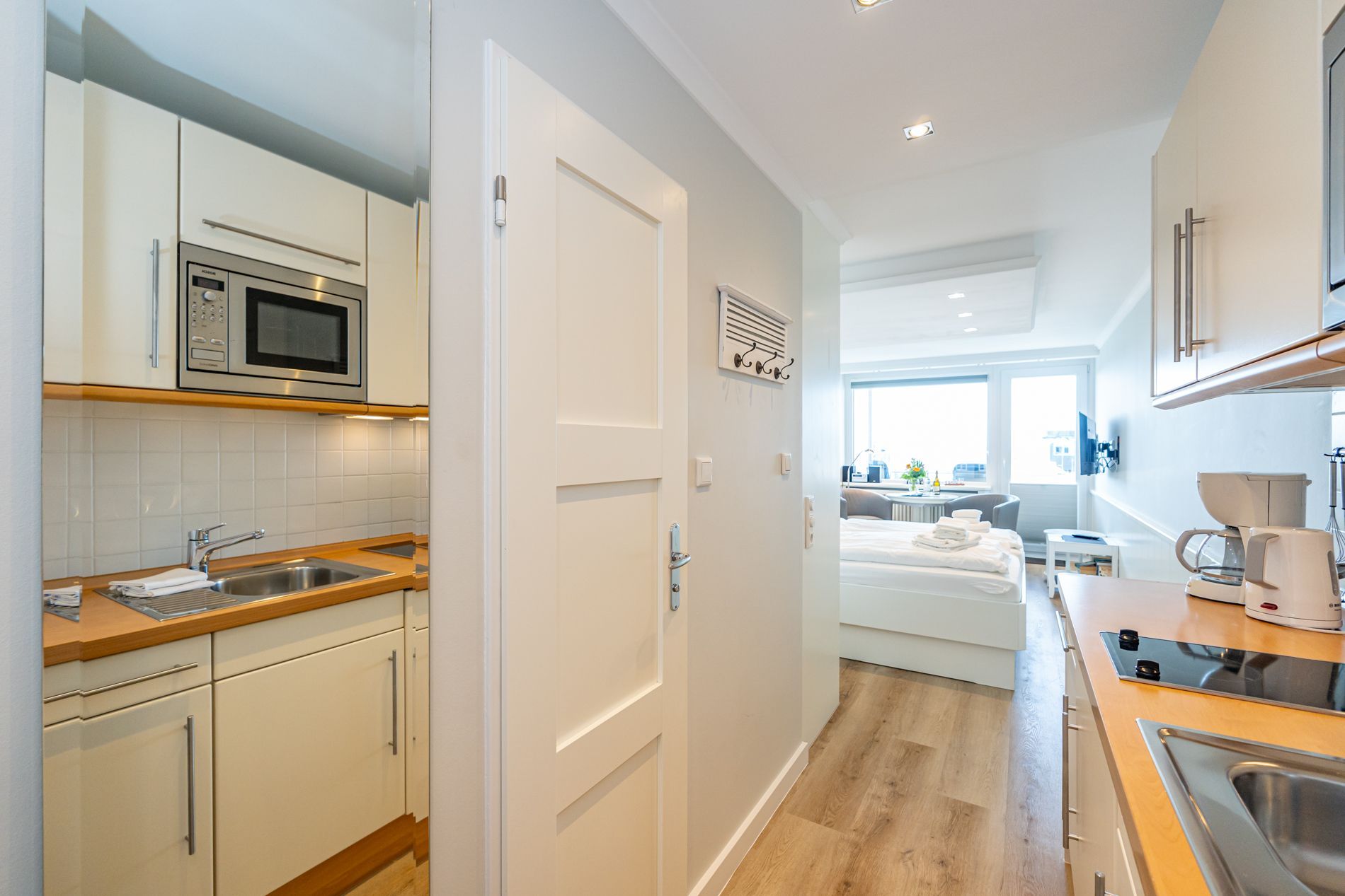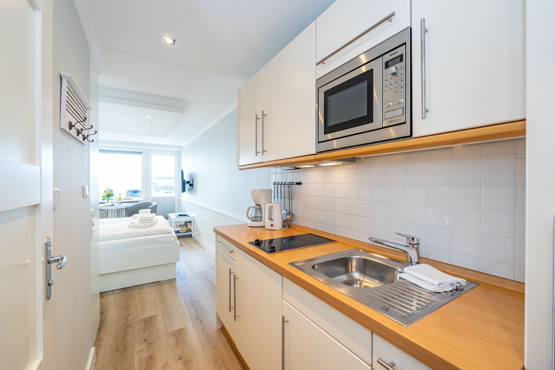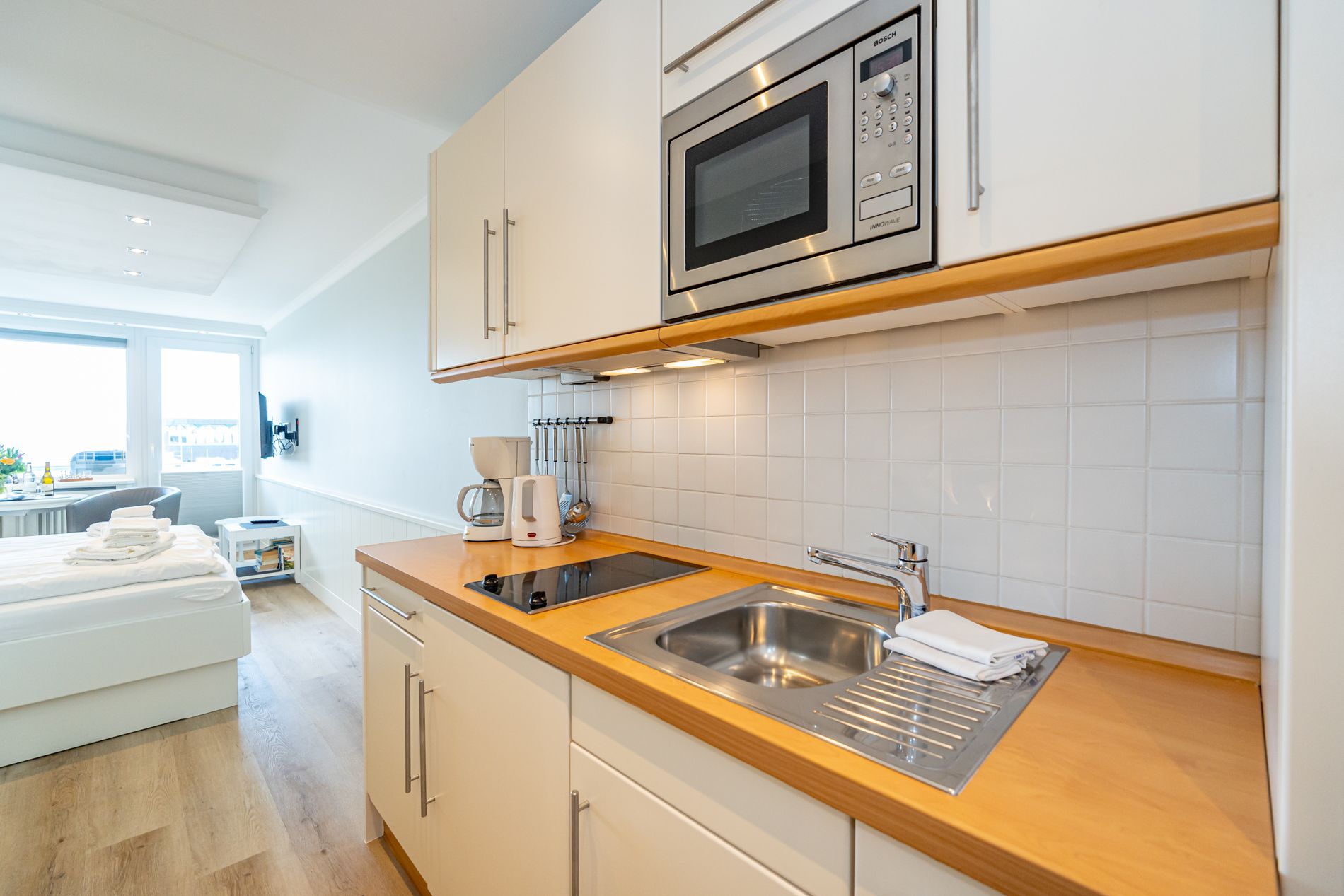 Vom Vorflur mit Garderobe und neuwertiger Küchenzeile gelangt man in das kombinierte Wohn-/Schlafzimmer (mit Austritt zum Balkon) und in das moderne Duschbad/WC. Der Wohn-/Schlafraum mit Designerboden in Holzoptik besteht aus 2 hochwertigen bequemen Esstischstühlen mit Armlehnen, einem dazugehörigen Esstisch, feststehendem Tischler-Einbau-Doppelbett (1,80 x 2 m mit guten Einzelmatratzen), abgehängte Decken mit LED-Lichtband und Downlights, Tischler-Einbau-Kleiderschrank mit Schiebetüren, großem Kabel-Flachbild-TV mit Wandhalterung, Radio/CD. Die offene Einbau-Küchenzeile ist mit Cerankochfeld, Nespresso-Maschine, Mikrowelle mit Grillfunktion und einem Kühlschrank mit 3*-Gefrierfach ausgestattet. Kaffeemaschine, Wasserkocher und Toaster gehören zur Grundausstattung.