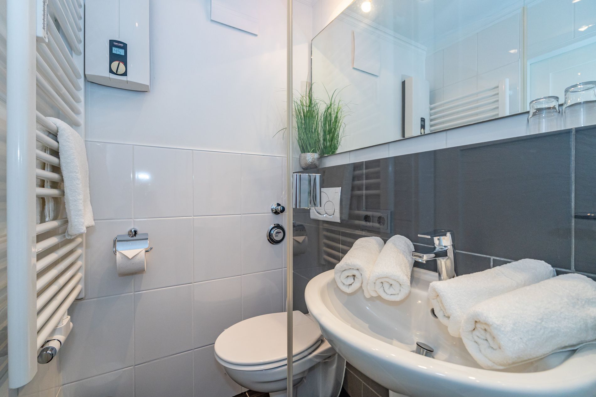 Das moderne Badezimmer besitzt eine Dusche mit extraflachem Einstieg, Waschtisch, Handtuchtrockner, festinstalliertem Fön und WC.