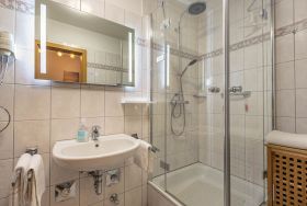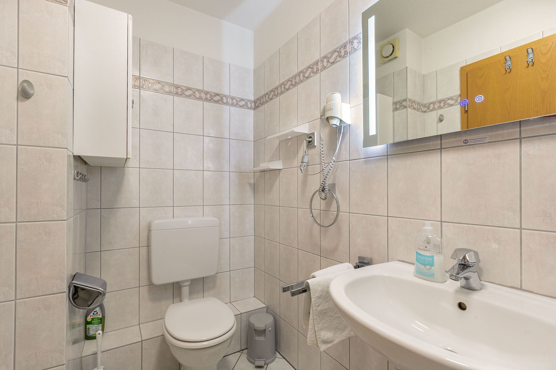 Badezimmer (Duschbad) mit Dusche, WC und Föhn.