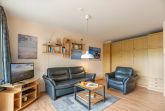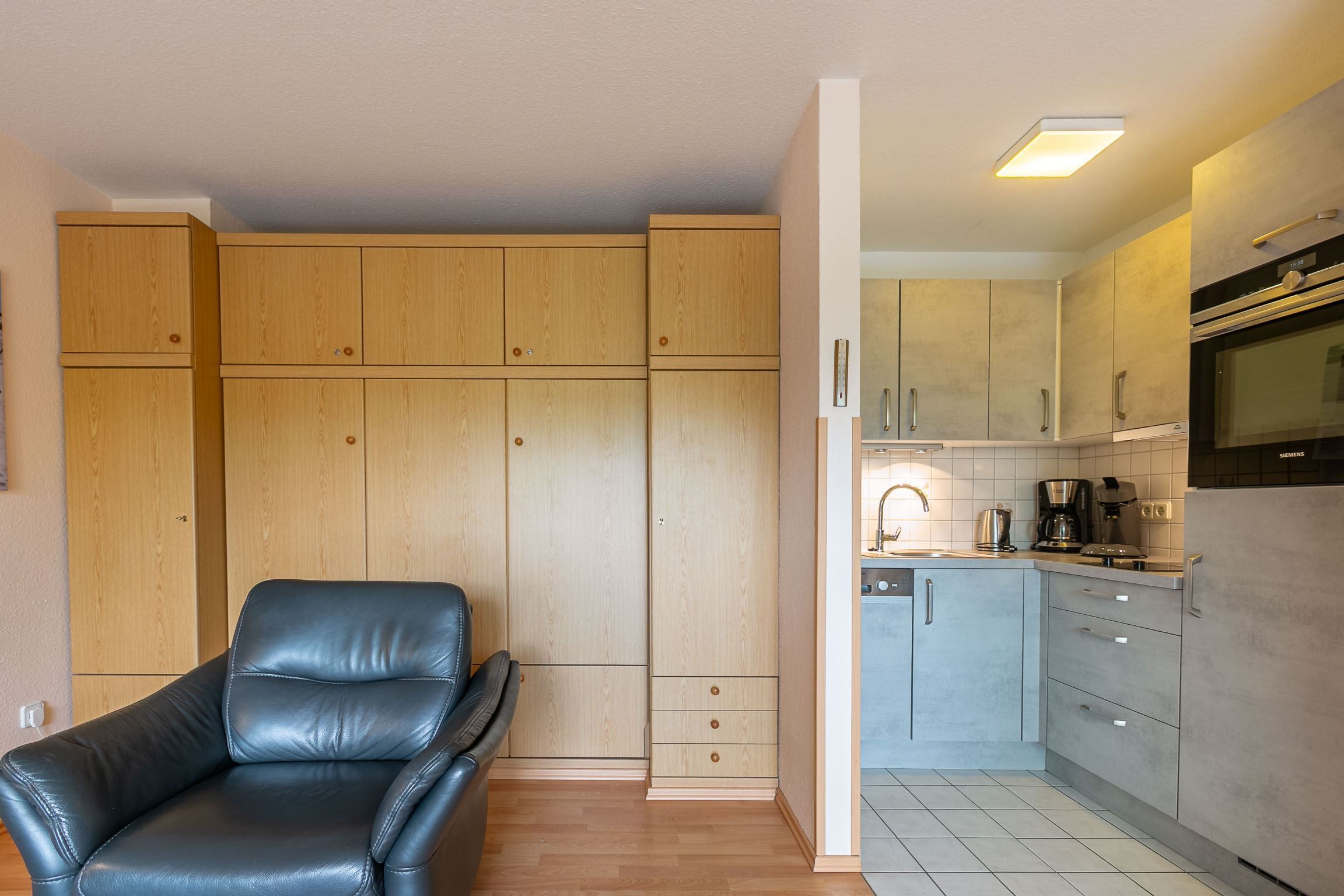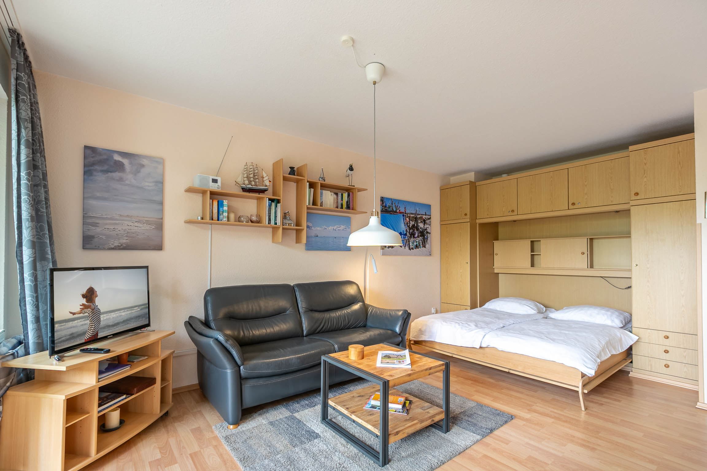 Wohnzimmer mit Sofa für 2 bis 3 Personen, 2 Sesseln, TV (Kabel), Radio, Esstisch mit 4 Stühlen und Schrank-Doppelbett (2x 80x200cm). Direkter Zugang zum überdachten Balkon nach Süden mit kleinem Meerblick. Offene Küche mit Backofen, Mikrowelle, Herd mit 2 Ceran-Kochfeldern, Geschirrspüler, Kühlschrank mit Gefrierfach und Philips Senseo Kapsel-Kaffeemaschine.