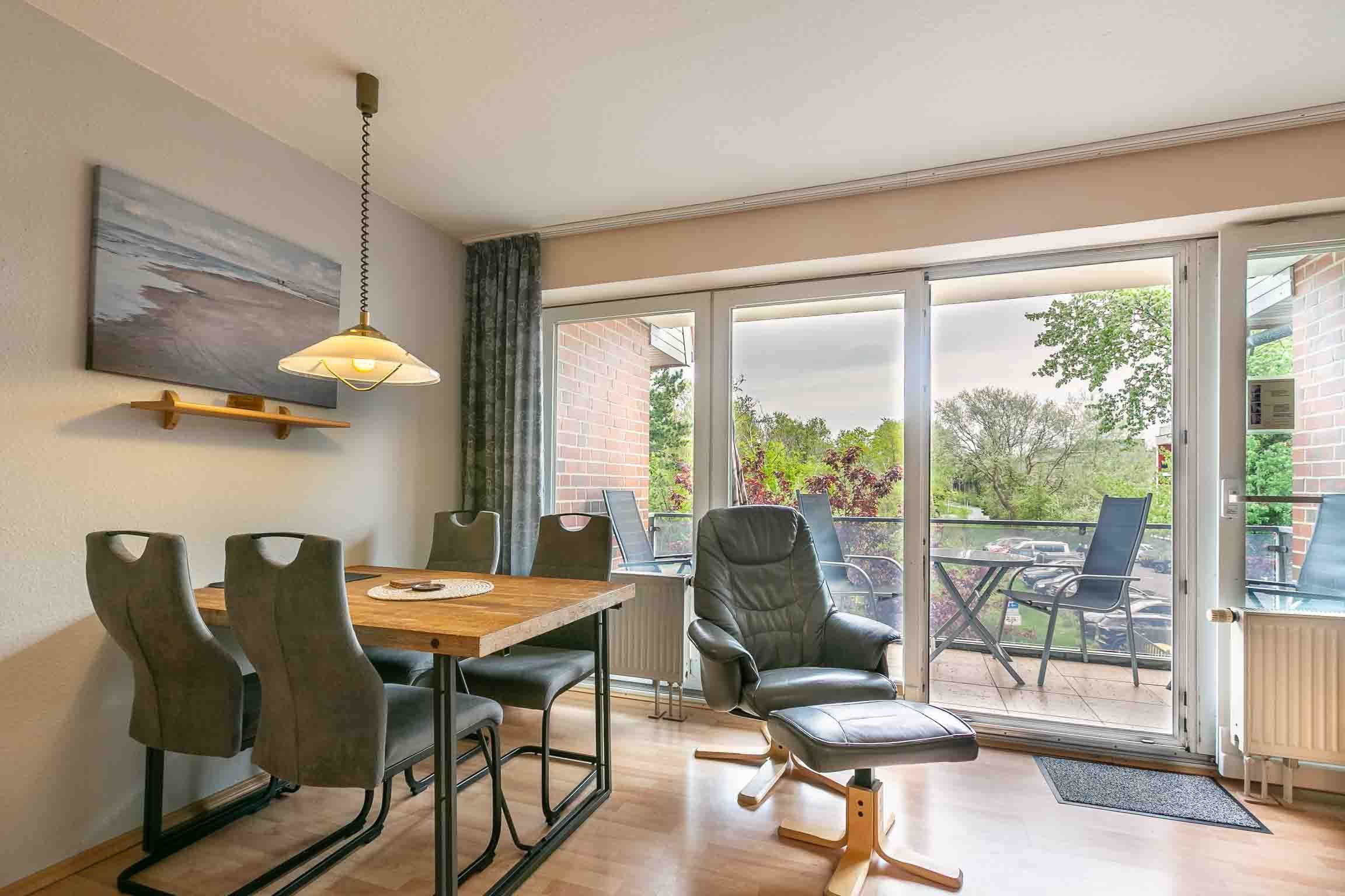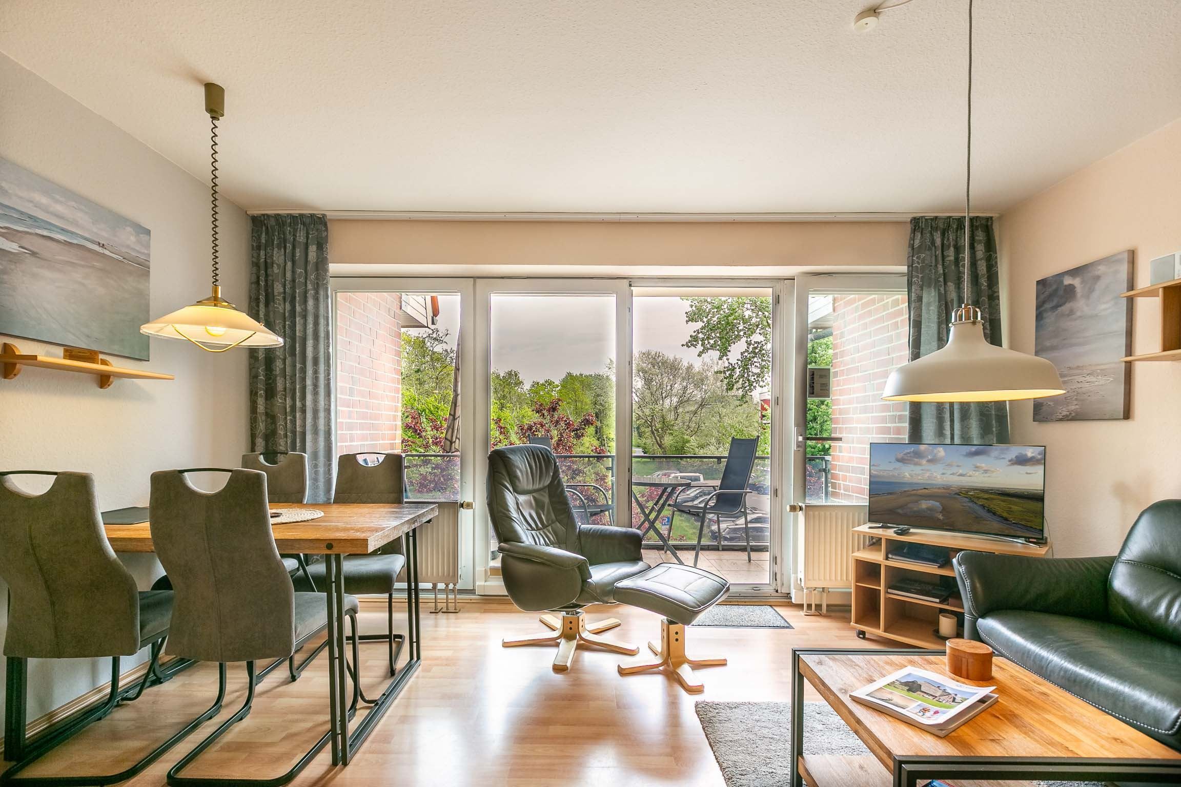 Gemütliche 2-Zimmer-Ferienwohnung mit ca. 45 m² auf 1 Ebene (2. OG, kein Fahrstuhl) in zentraler und strandnaher Lage im Herzen des Ortsteils Bad in St.Peter-Ording. Genießen Sie den schönen Ausblick vom Balkon auf das Wäldchen am Haus und ein kleines bißchen vom Strand. Gleich um die Ecke vom Haus befinden sich alle Geschäfte und Restaurants des pulsierenden Kurzentrums. Auch die Dünentherme ist nur 5 Gehminuten entfernt. Allergikerfreundliches Domizil ohne Teppichböden.
