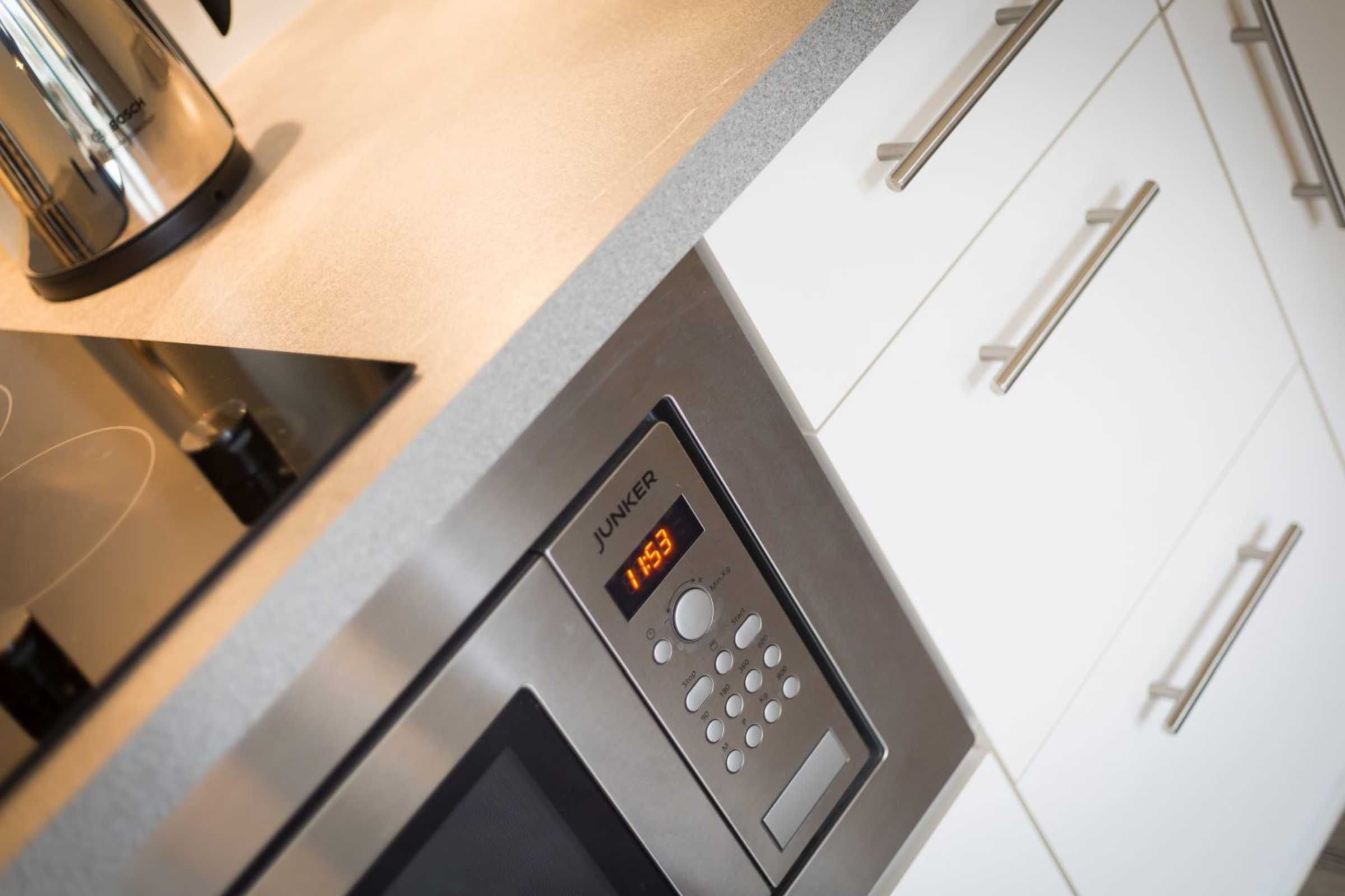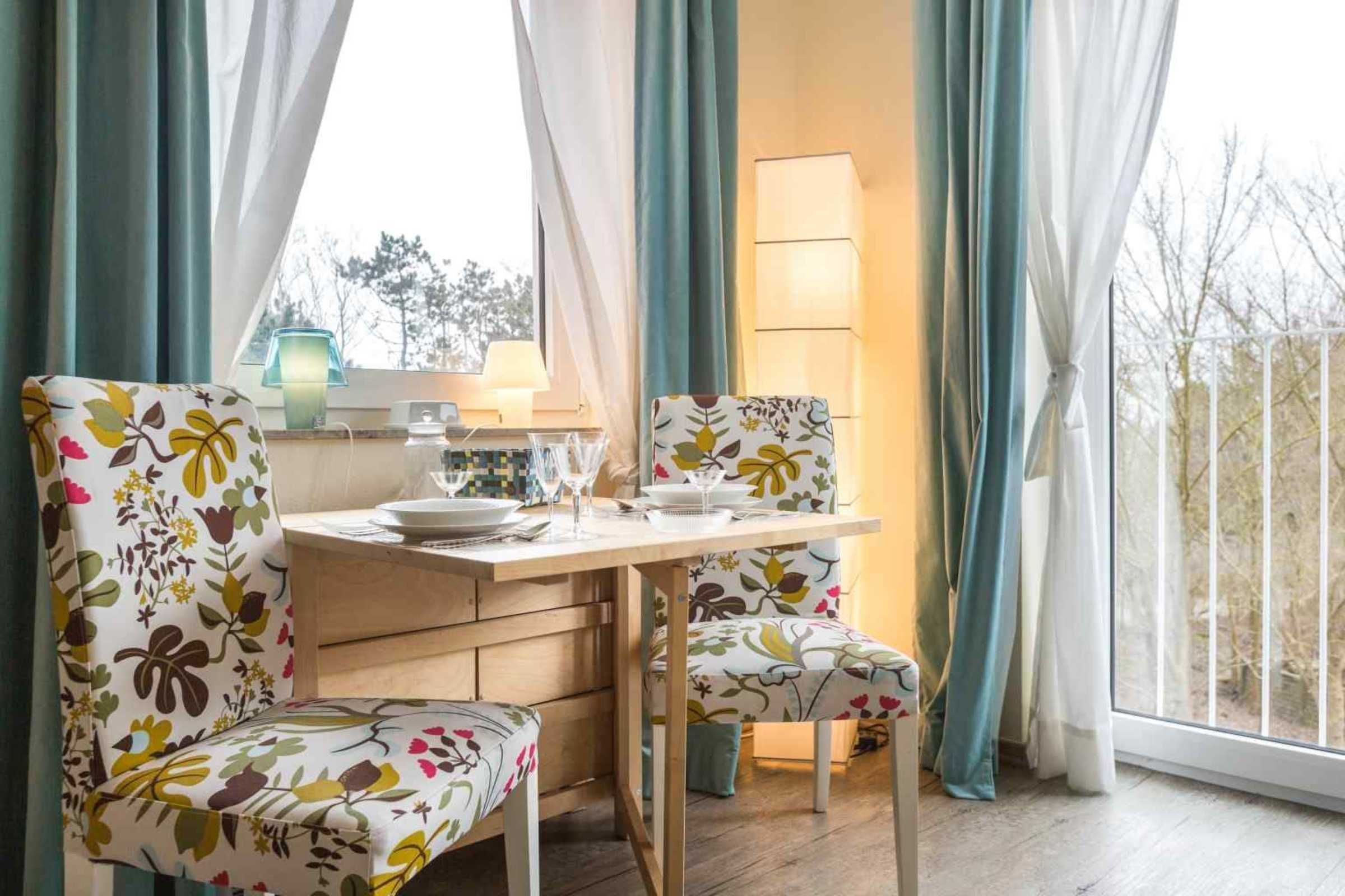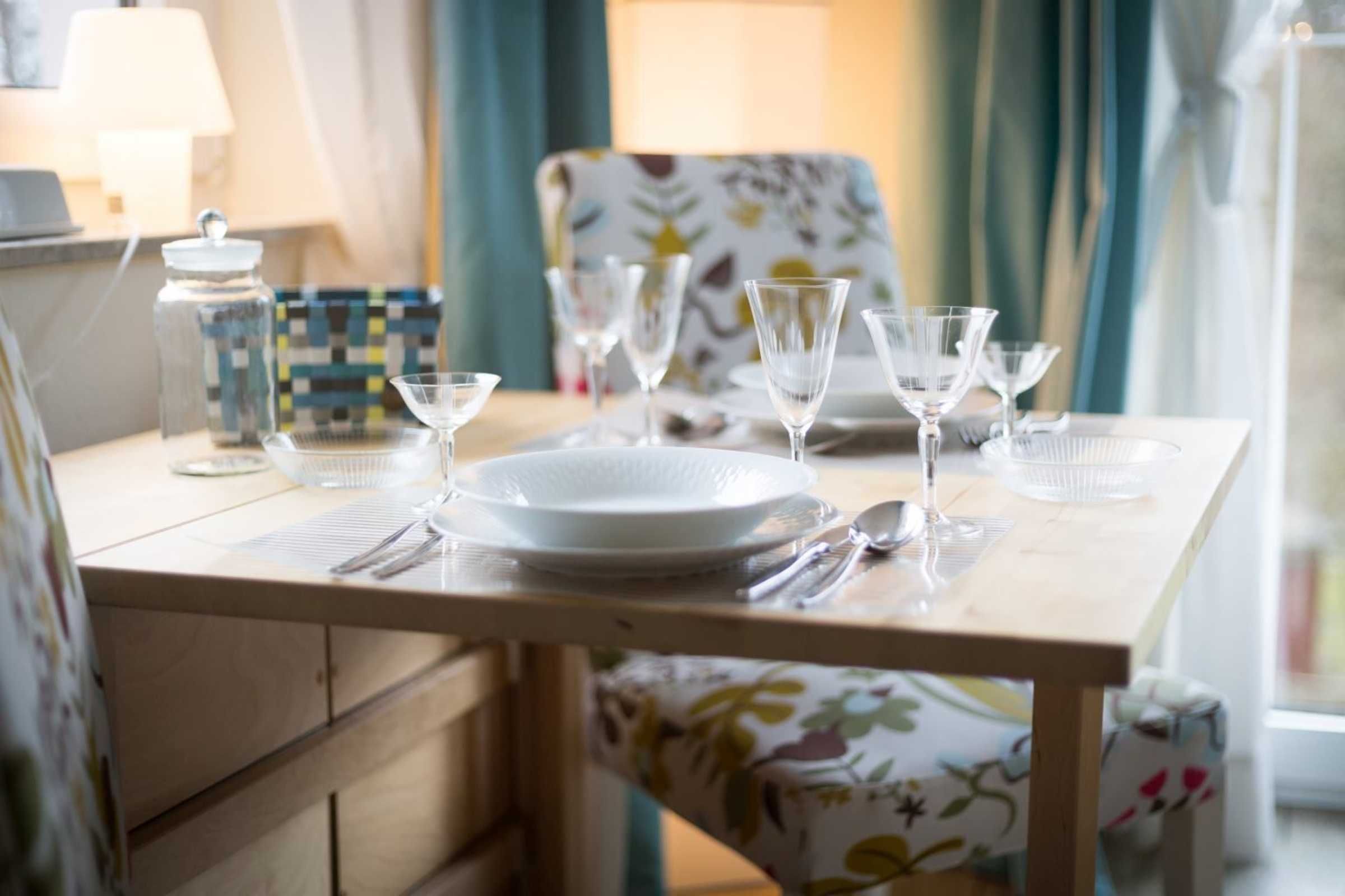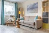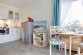Wohn- und Schlafzimmer mit ausziehbarem (Schlaf-) Sofa (160x190cm), Sessel, Esstisch mit 2 Stühlen, TV (Sat), DVD-Player und Radio. Französischer Balkon. Offene Küche mit Herd mit 2 Kochstellen, Mikrowelle und Kühlschrank mit Gefrierfach.