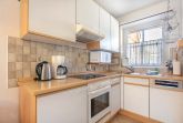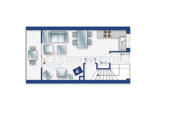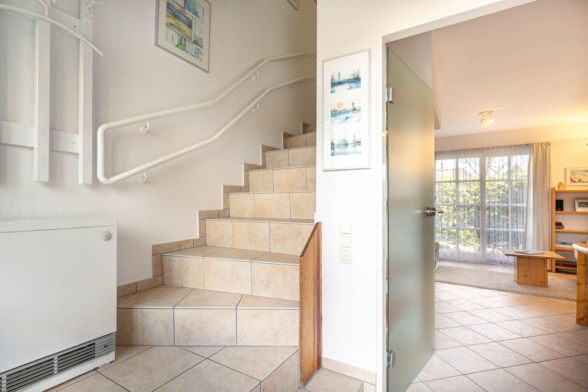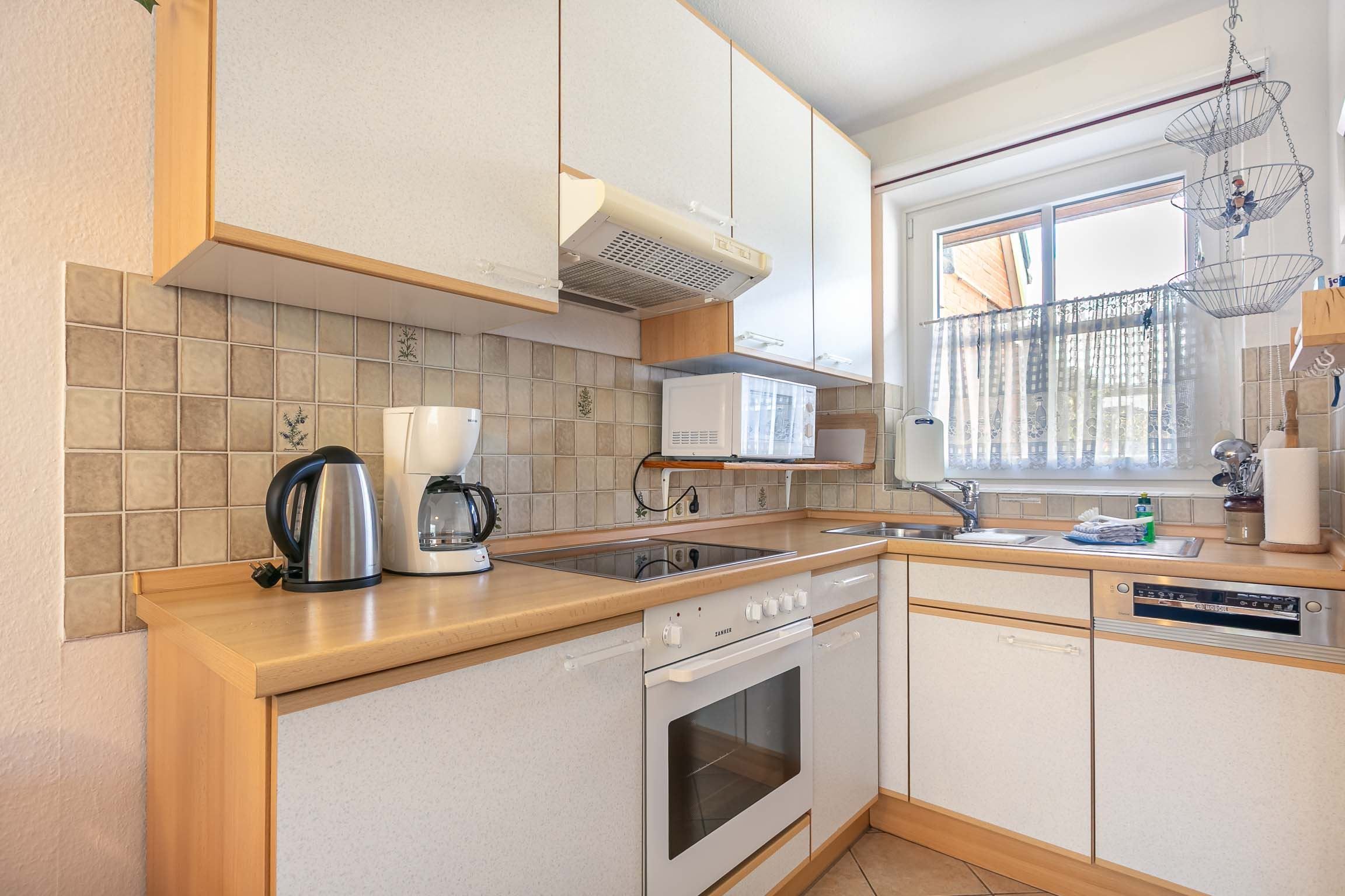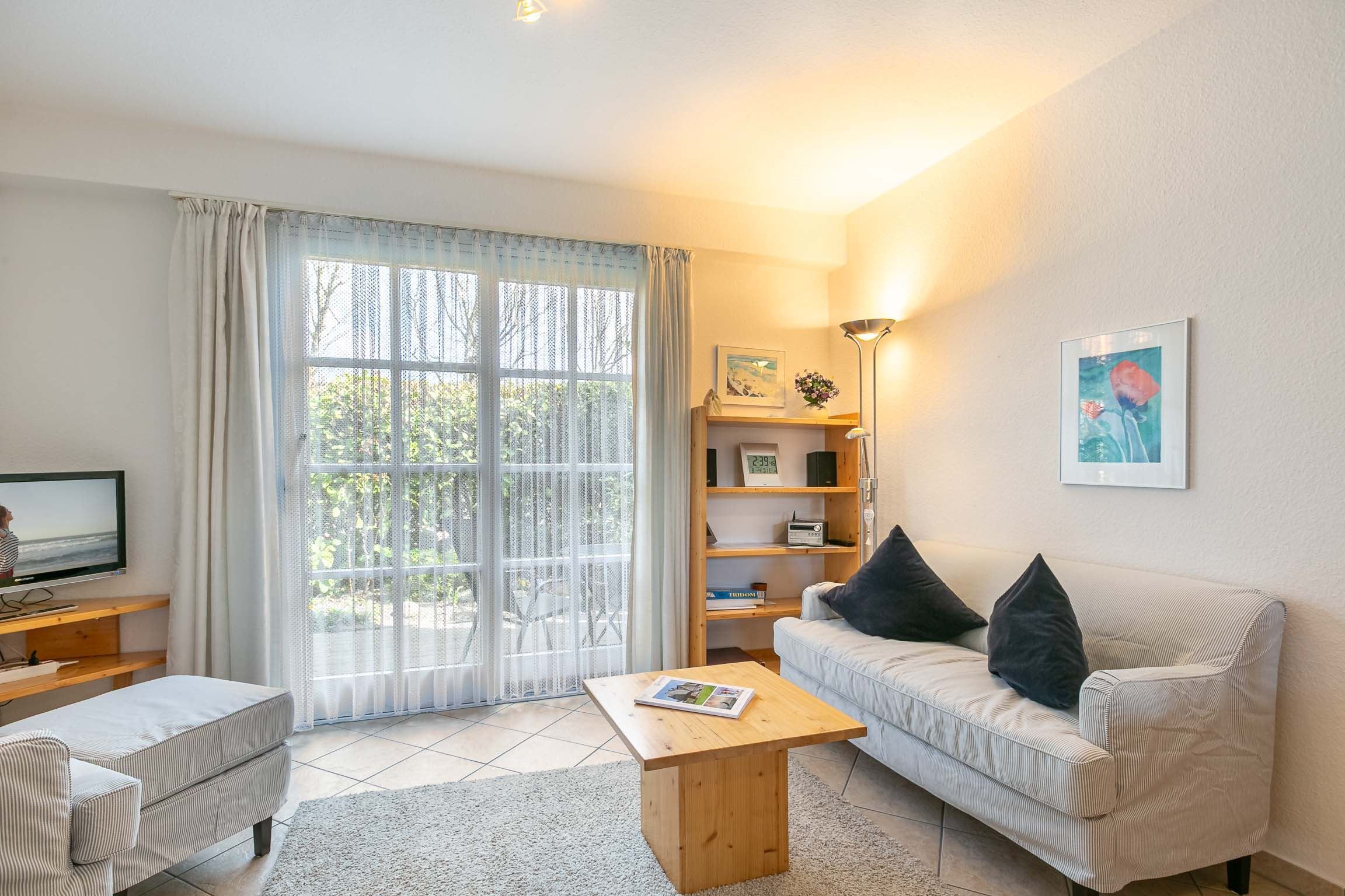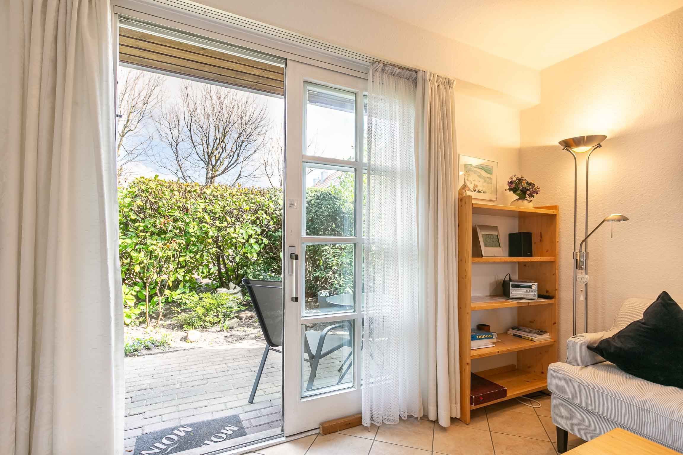 Wohnzimmer mit Sofa (2er), 2 Sesseln, Kaminofen, TV (Sat), DVD-Player, Stereo-Kompaktanlage und Esstisch mit 4 Stühlen. Direkter Zugang zur windgeschützten, möblierten Terrasse nach Osten. Offene Küche mit Backofen, Geschirrspüler und Kühlschrank mit Gefrierfach. Keine Mikrowelle. Abstellraum mit Staubsauger und Bügelset.