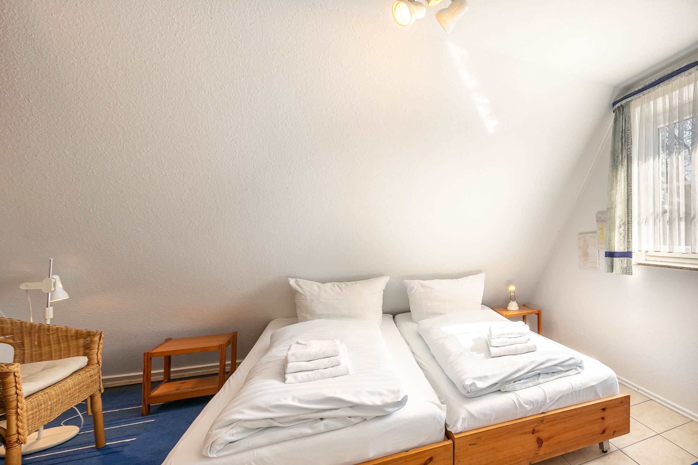 1. Schlafzimmer mit Doppelbett (2x 90x190cm), Kleiderschrank, 2 Sesseln und Radio.