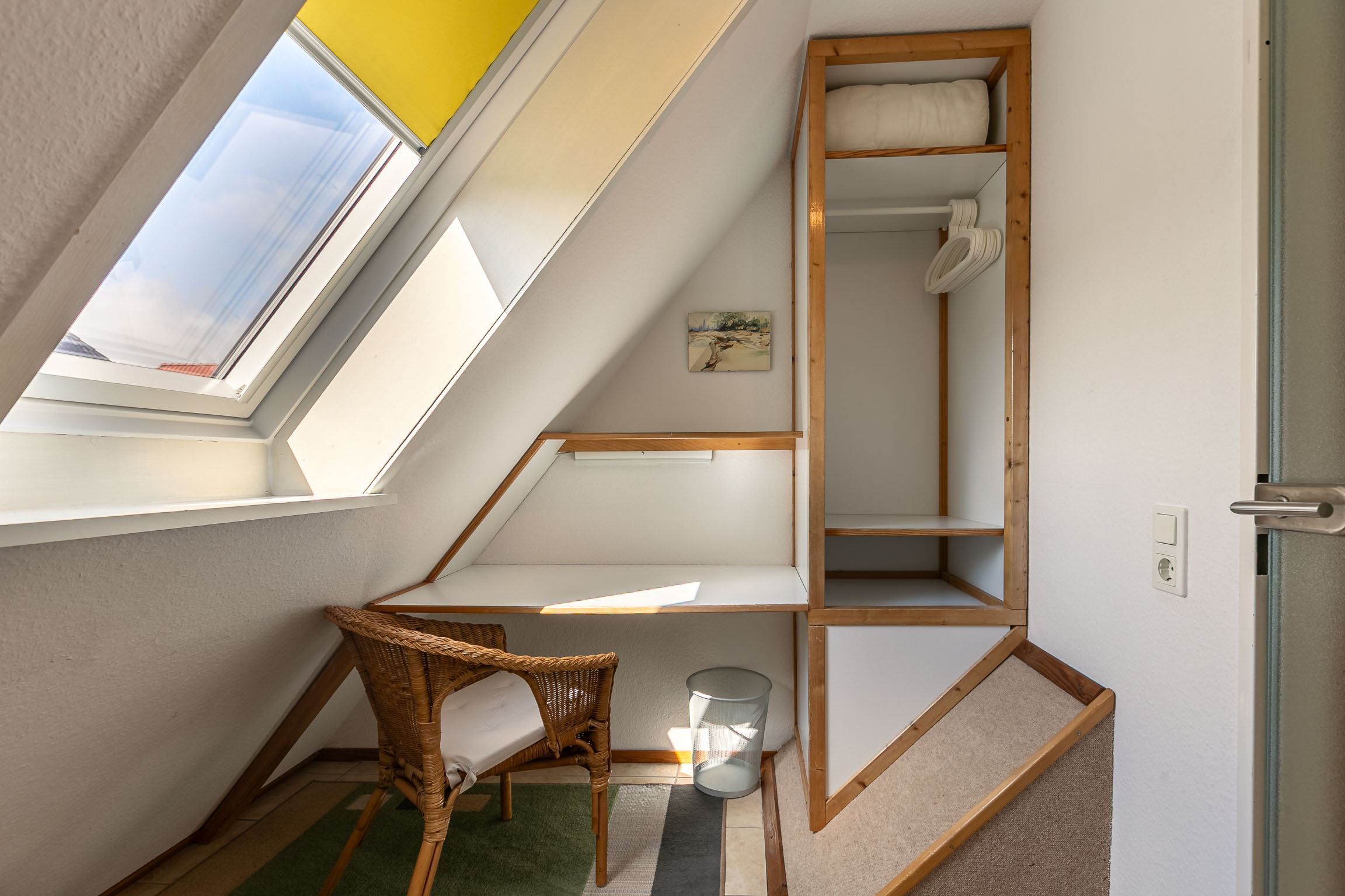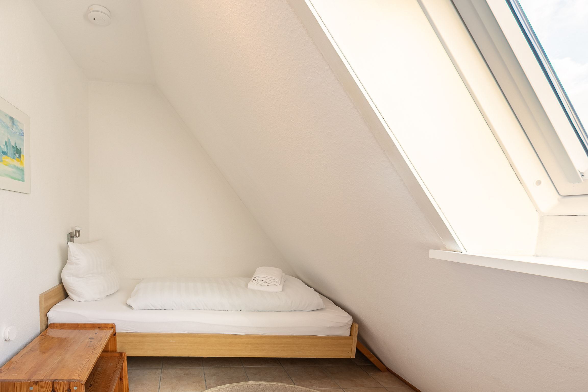 2. Schlafzimmer mit Einzelbett (90x190cm), Schreibtisch, Stuhl und Garderobe.