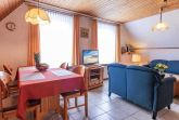Wohnzimmer mit 2 bequemen Sofas (3er und 2er), Sessel, TV (Sat), Stereo-Kompaktanlage und Esstisch mit 4 Stühlen. Offene Küche mit Backofen, Mikrowelle, Geschirrspüler und Kühlschrank mit Gefrierfach.
