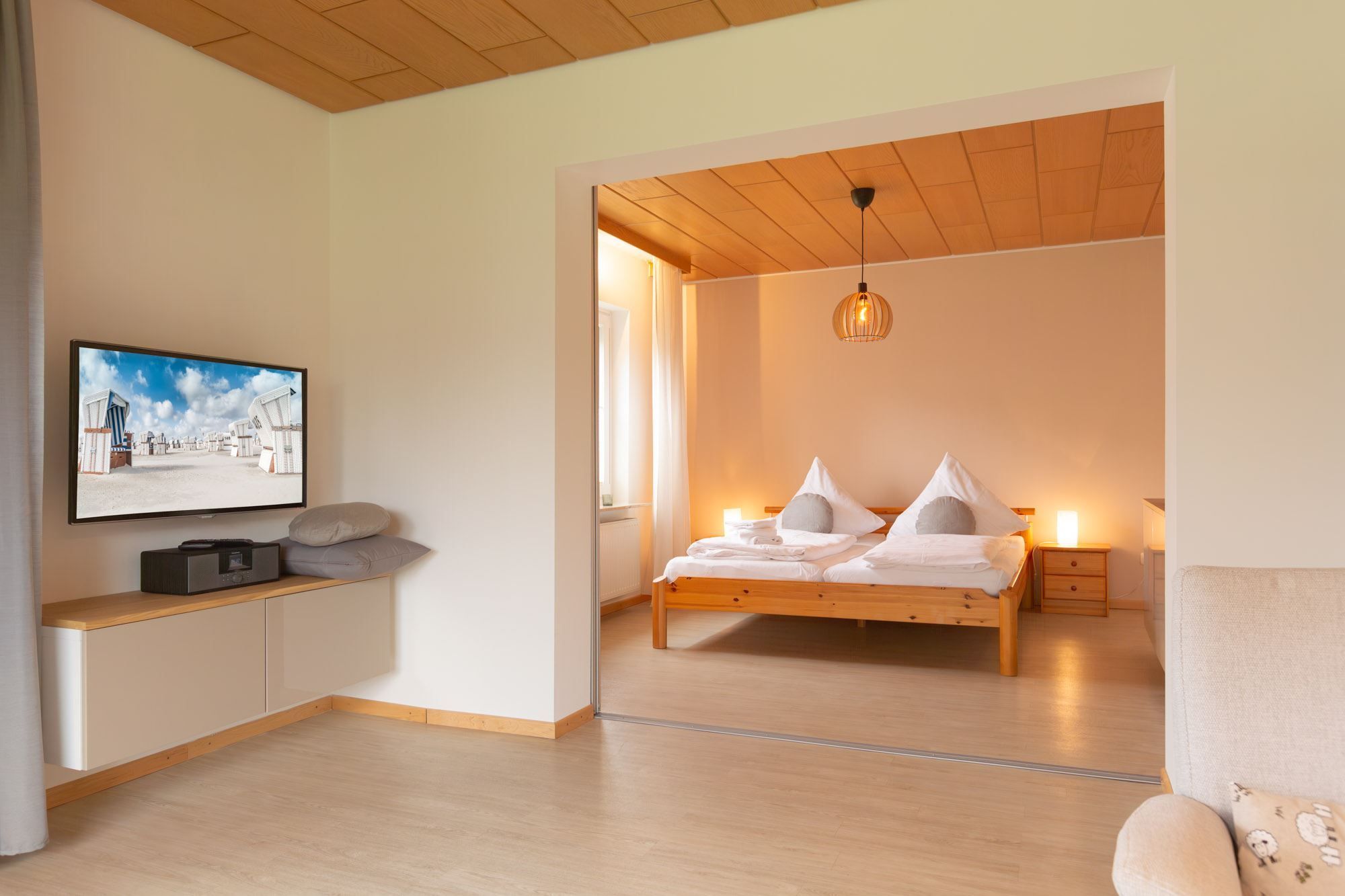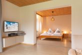 1. Schlafzimmer mit Doppelbett (2x 90x200cm) und Kleiderkommode. Dieses Schlafzimmer ist durch eine Schiebetür vom Wohnzimmer abgeteilt.