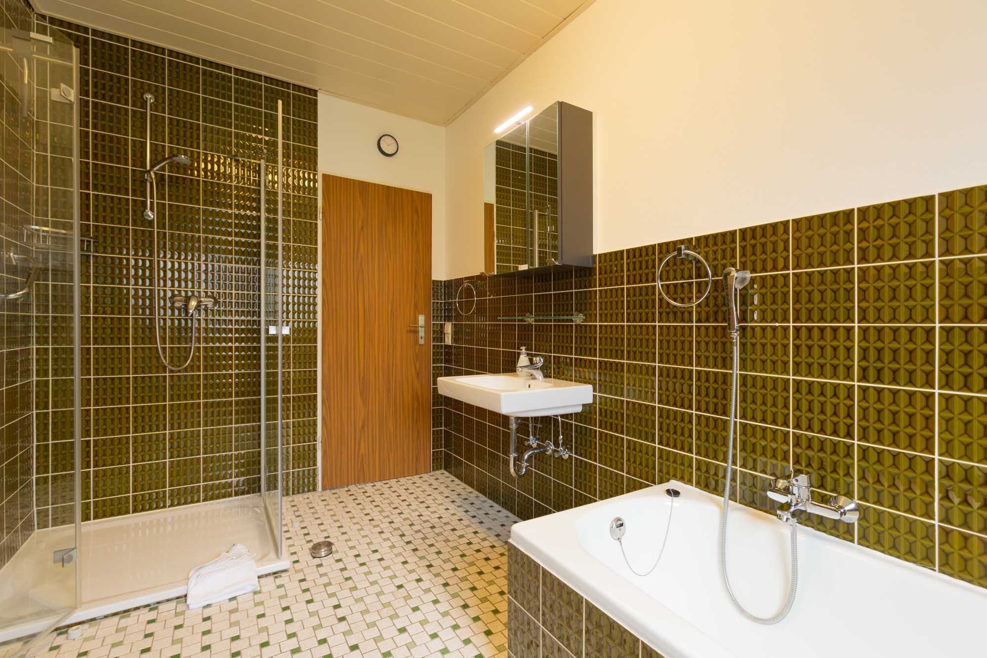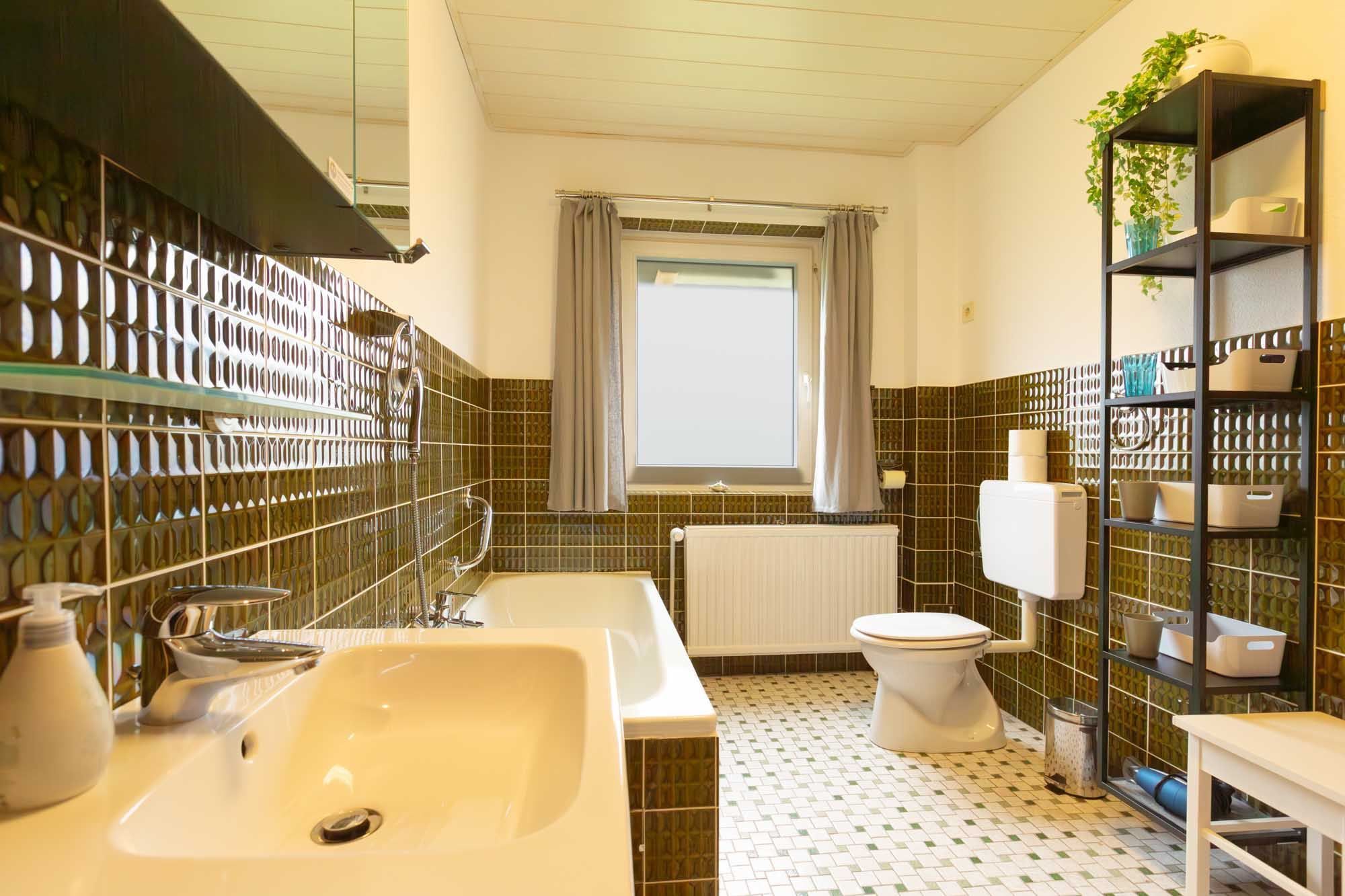 Badezimmer (Wannenbad) mit Badewanne, separater Dusche, WC, Tageslicht und Föhn.