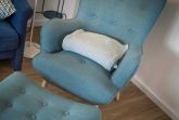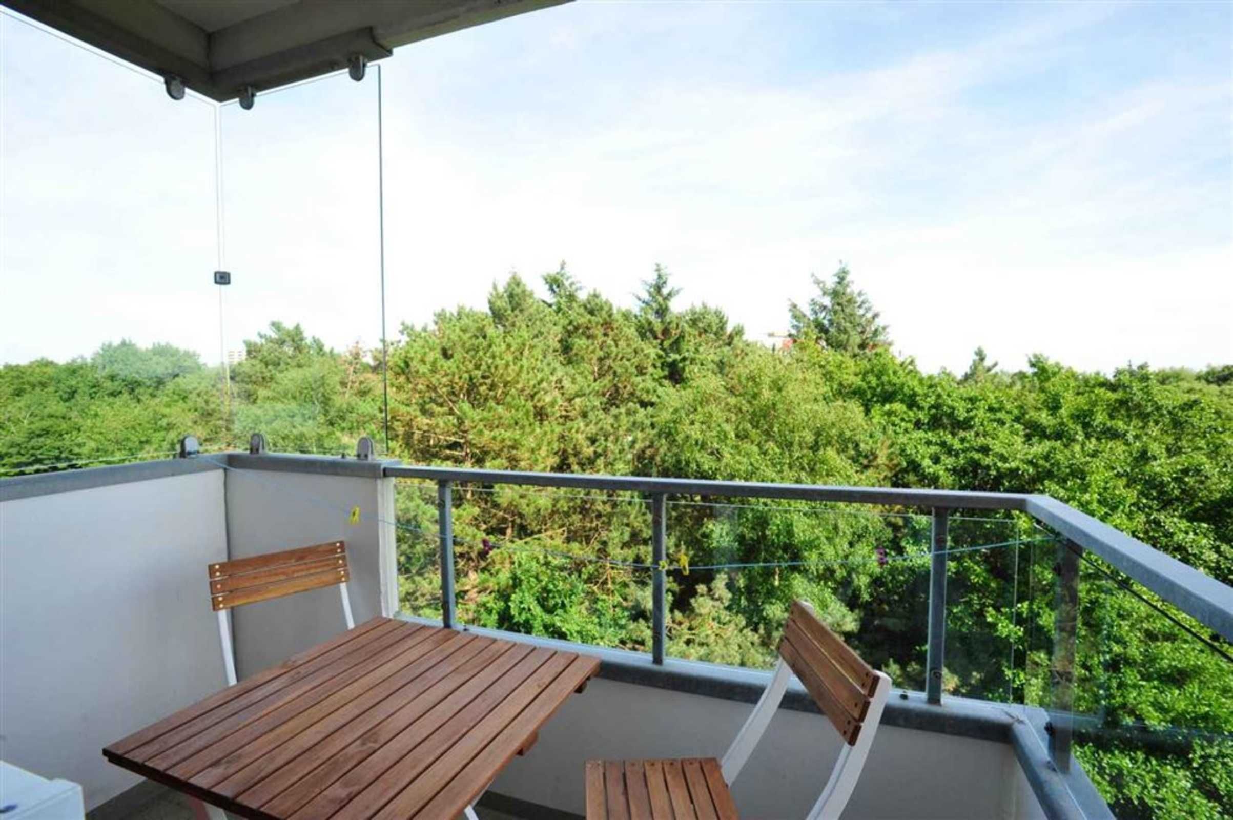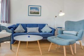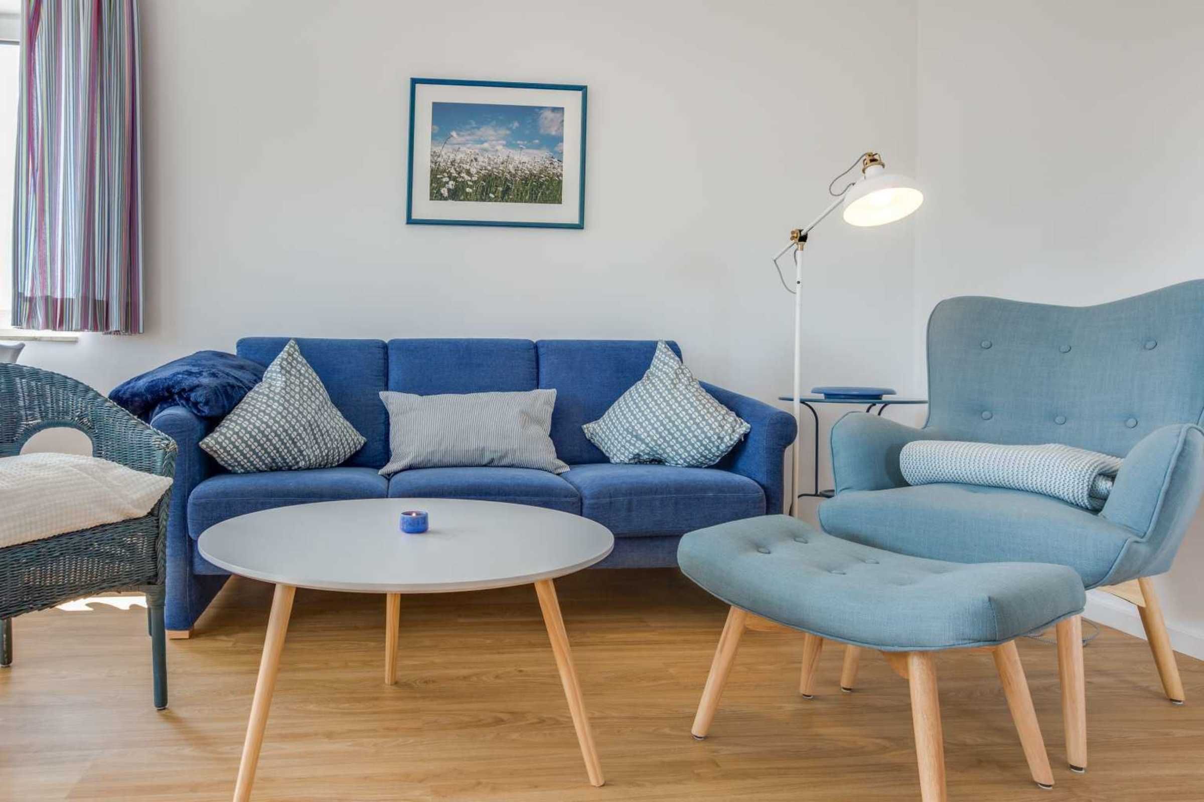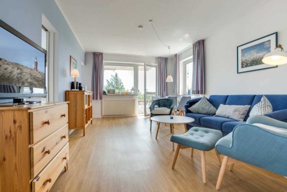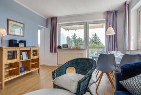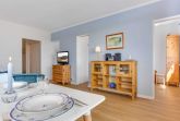 Wohnzimmer mit Sofa für 2-3 Personen, 2 Sesseln, TV (Sat), Stereo-Kompaktanlage und Esstisch mit 4 Stühlen. Direkter Zugang zum möblierten, windgeschützten Balkon nach Südwesten.