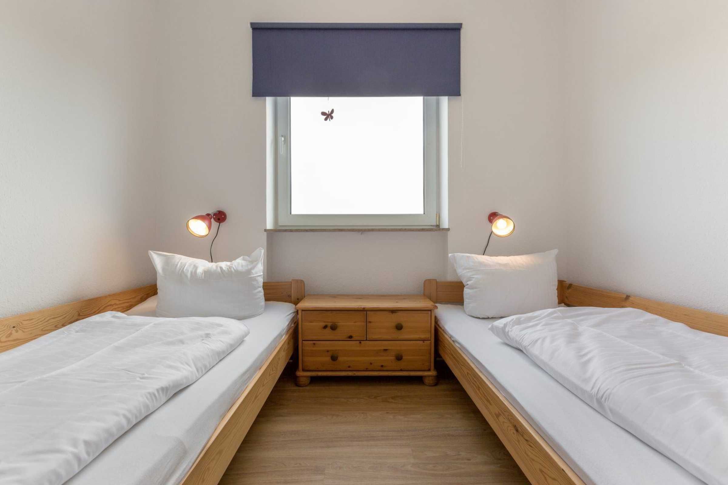 2. Schlafzimmer mit 2 Einzelbetten (je 90x200cm). Beide Schlafzimmer sind durch Schiebetüren vom Wohnzimmer abgeteilt.
