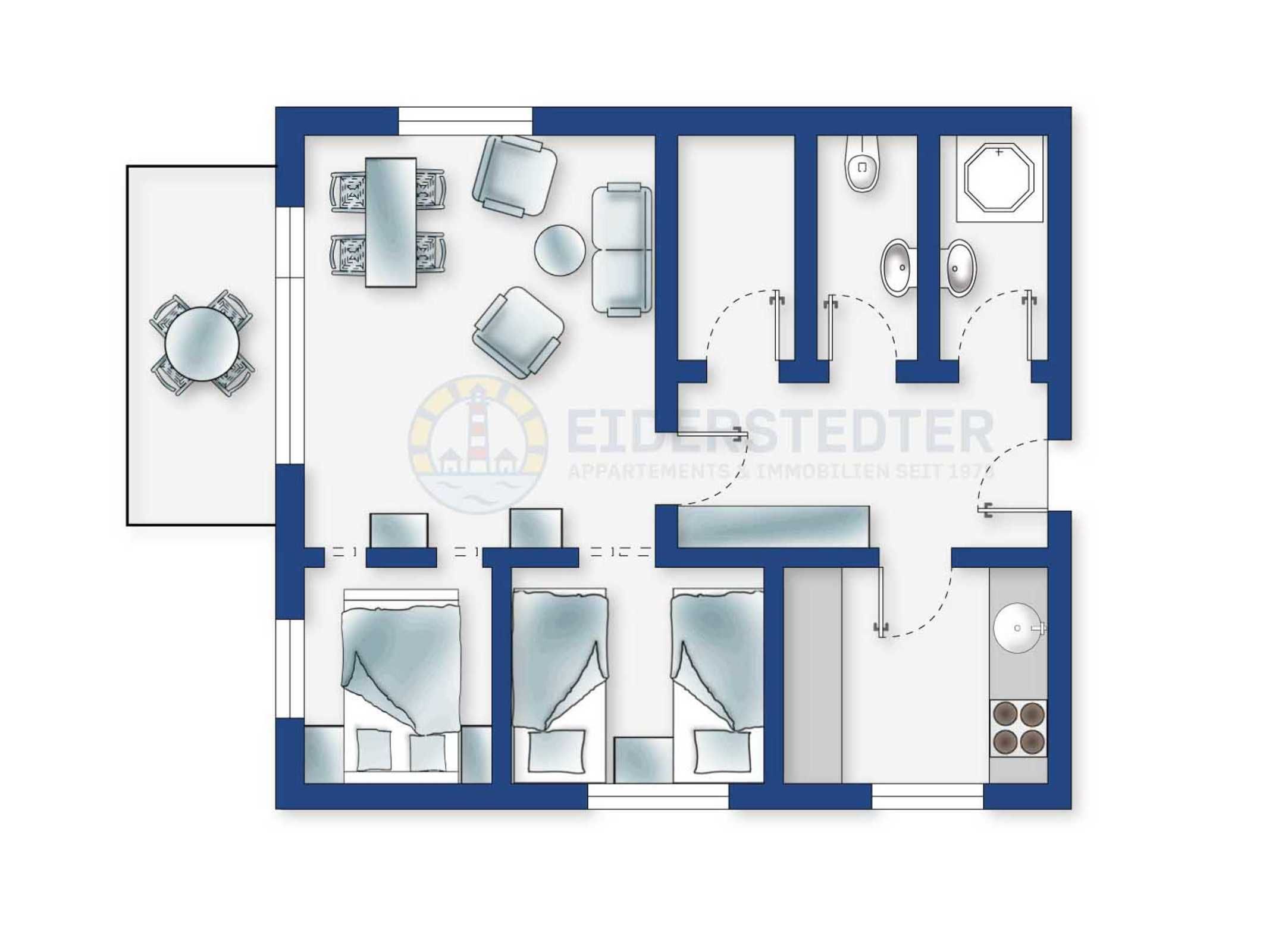 Geschmackvoll eingerichtete 3-Zimmer-Ferienwohnung mit ca. 48 qm auf 1 Ebene (4. OG, mit Fahrstuhl) für bis zu 4 Personen. In strandnaher Lage direkt am Deich im Ortsteil Bad in St. Peter-Ording. Die Strandpromenade ist direkt vor dem Haus und zu allen Geschäften und Restaurants des Kurzentrums ist es nur ein kurzer Fußweg. Genießen Sie den wunderschönen, weiten Ausblick über den Strand und das Meer bis zum Horizont. Entspannung und Erholung garantiert durch frische Seeluft und den Sauna-Bereich im Haus. Ideal für Ihren erholsamen Verwöhnurlaub an der Nordsee!