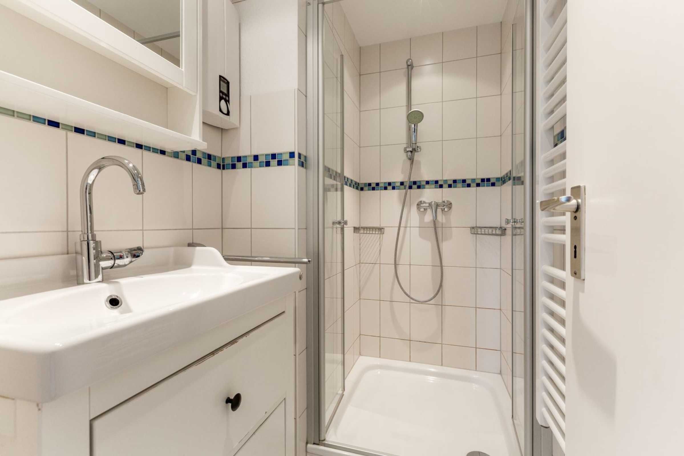 Badezimmer (Duschbad) mit Dusche (niedriger Eintritt: ca. 15cm), Handtuchwärmer und Föhn. Separates WC.