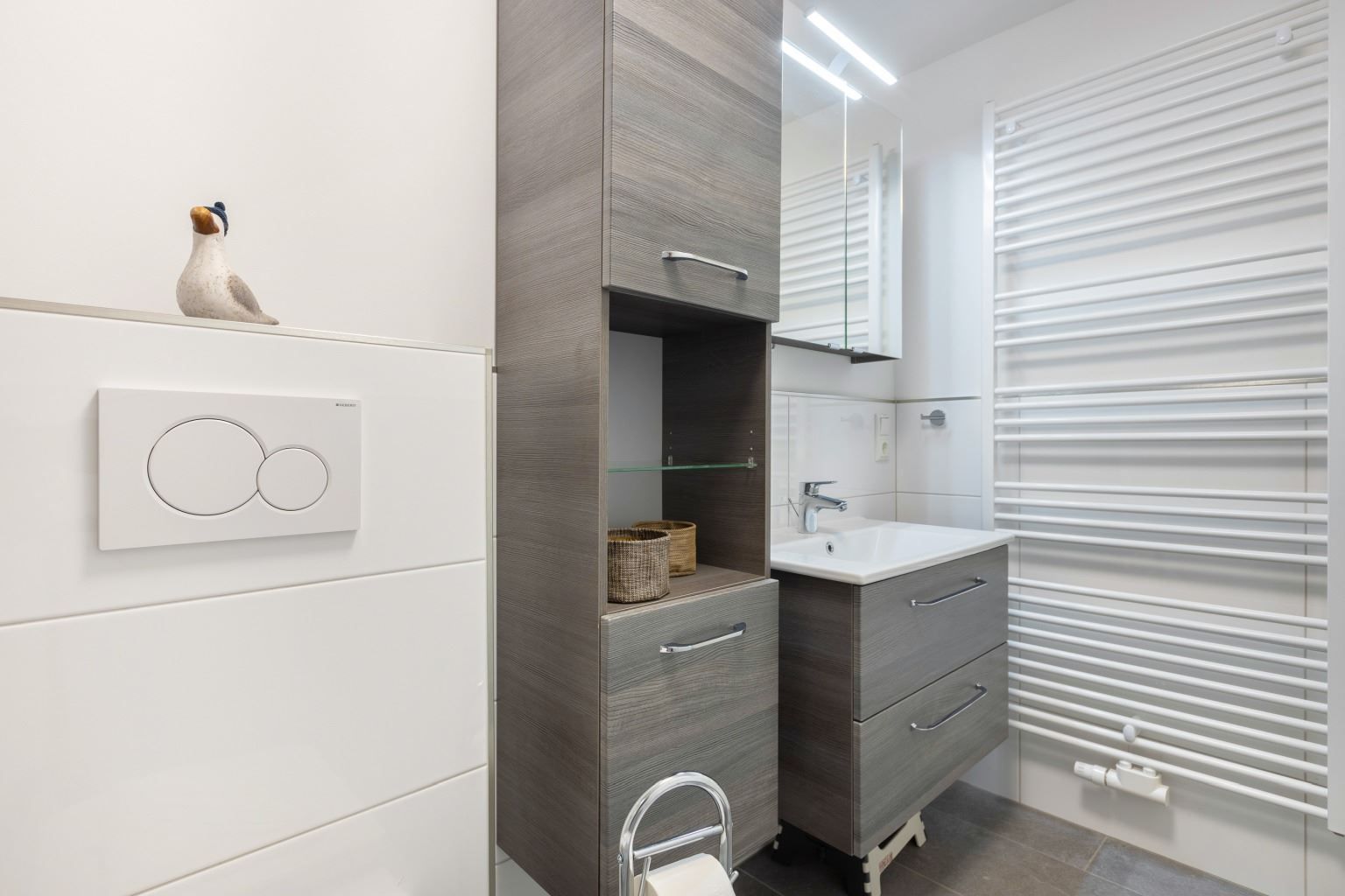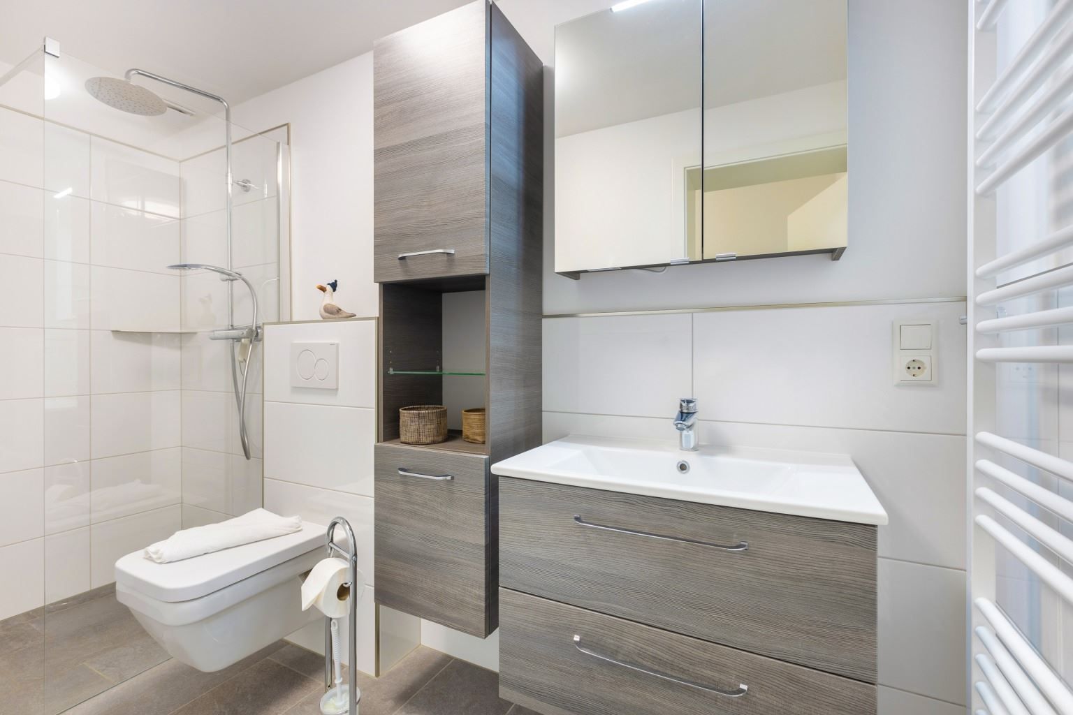 Badezimmer (Duschbad) mit ebenerdiger Regen-Dusche, WC, Handtuchwärmer und Föhn.