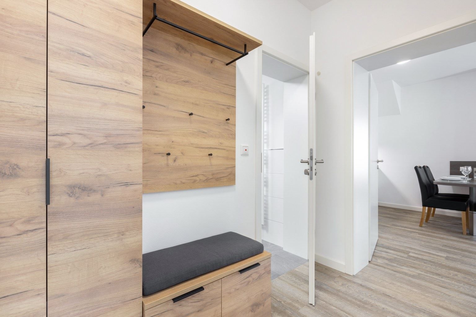 Flur mit Garderobe, Schuhbank und Haushaltsschrank im Eingangsbereich.