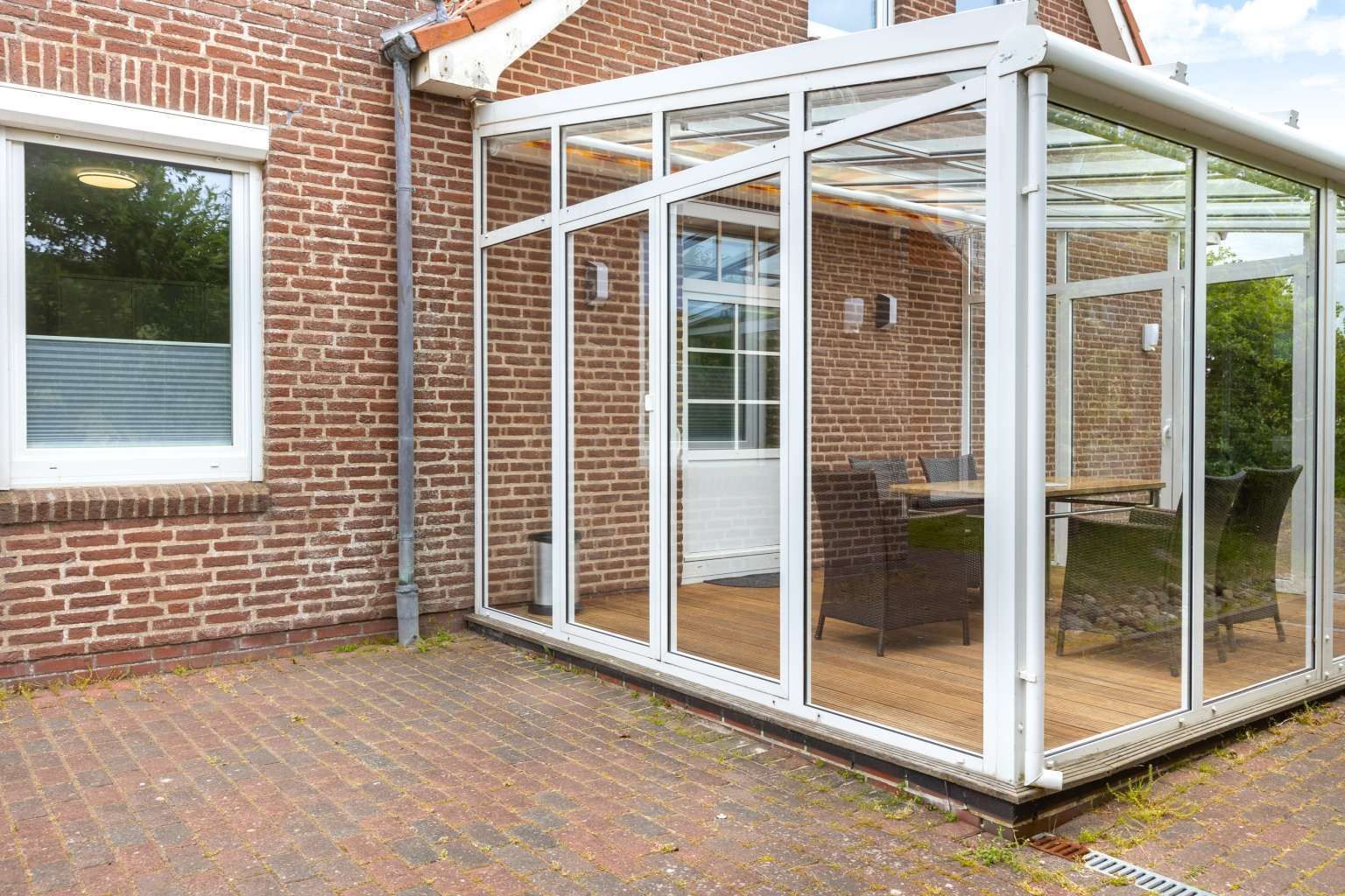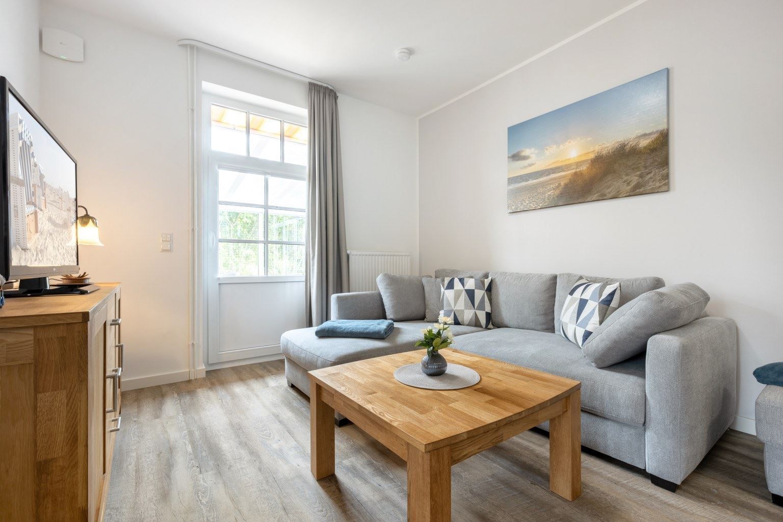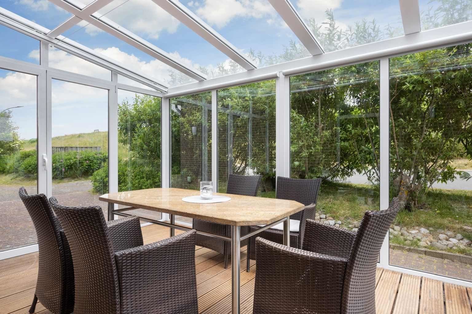 Wohnzimmer mit gemütlichem Ecksofa und TV (Sat). Direkter Zugang zum möblierten Wintergarten mit elektrischer Sonnenmarkise. Offene Küche mit Backofen, Mikrowelle, Geschirrspüler, Kühlschrank mit Gefrierfach und Esstisch mit 4 Stühlen.