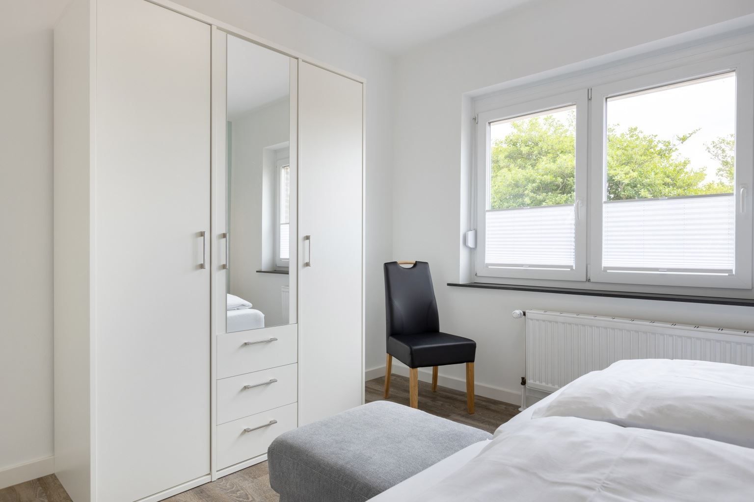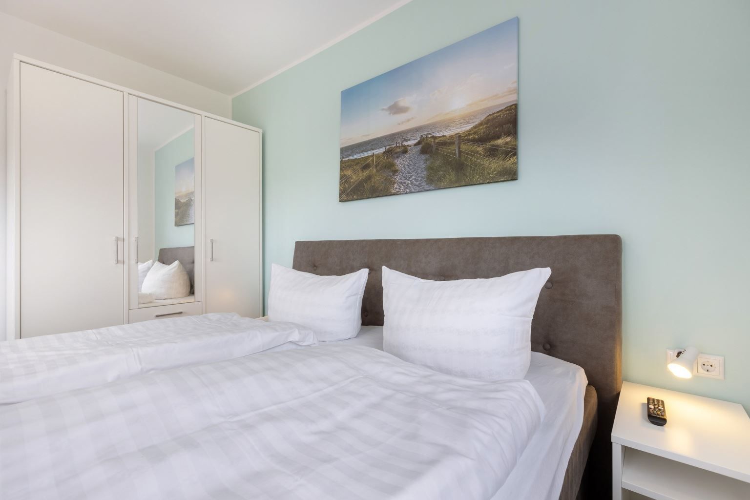 1. Schlafzimmer mit Doppelbett (2x 90x200cm), Kleiderschrank, Stuhl und Hocker.
