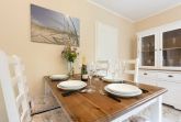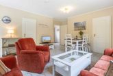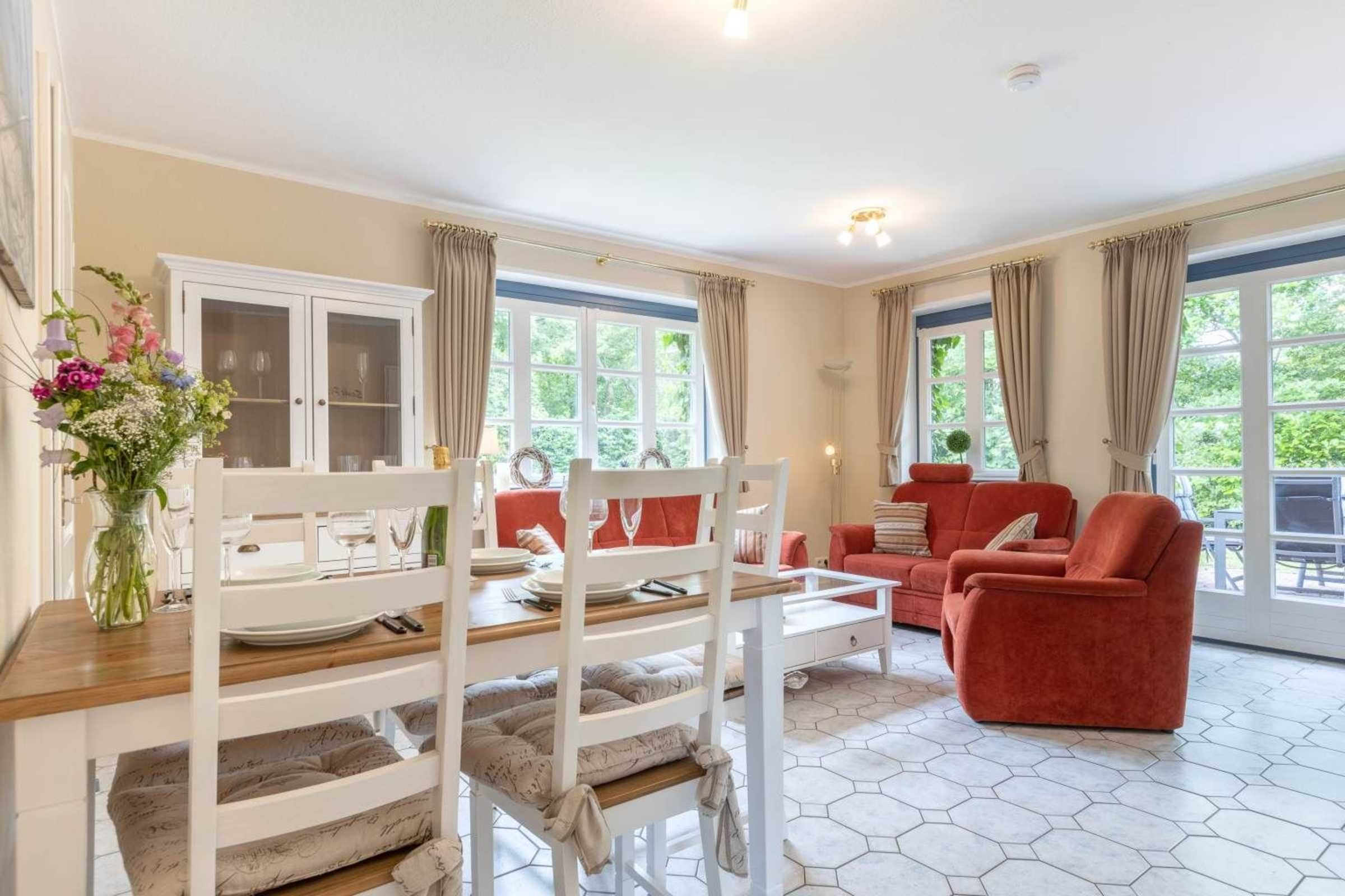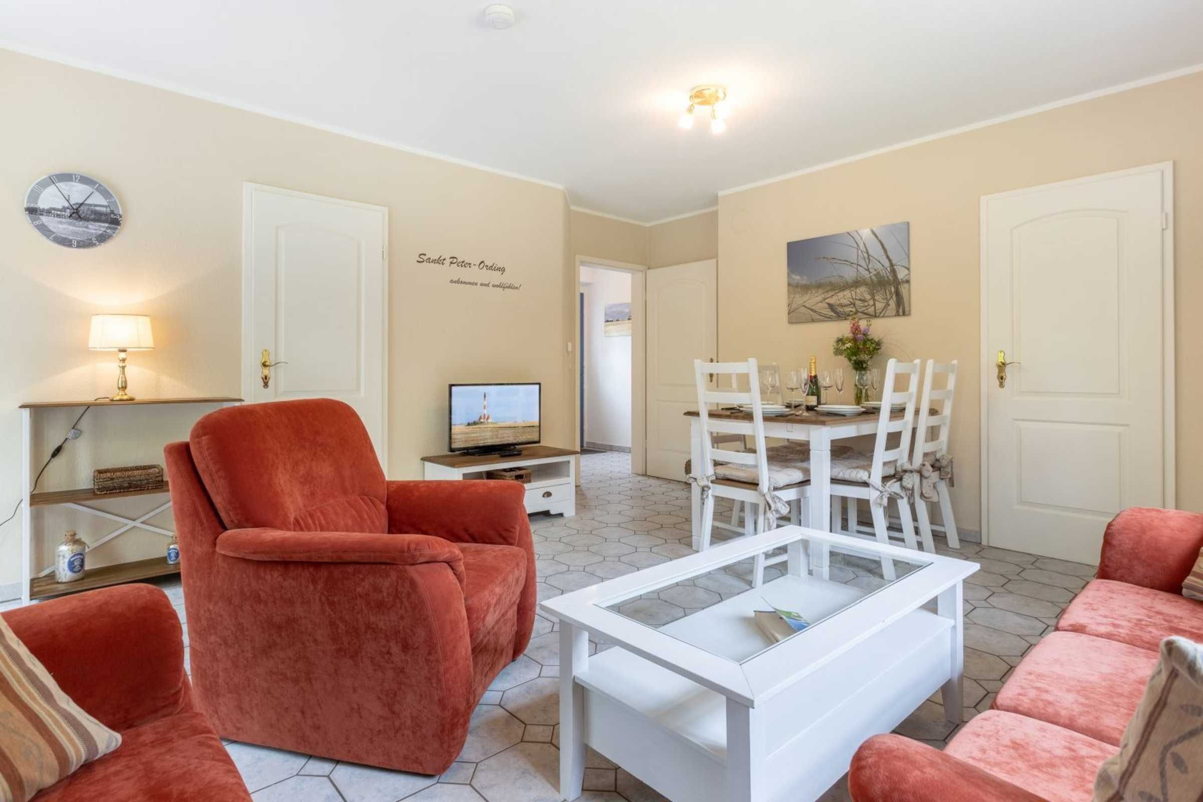 Wohnzimmer mit 2 Sofas (3er und 2er), Sessel, TV (Kabel) und Esstisch mit 5 Stühlen. Direkter Zugang zur schönen möblierten Terrasse nach Westen mit Strandkorb.