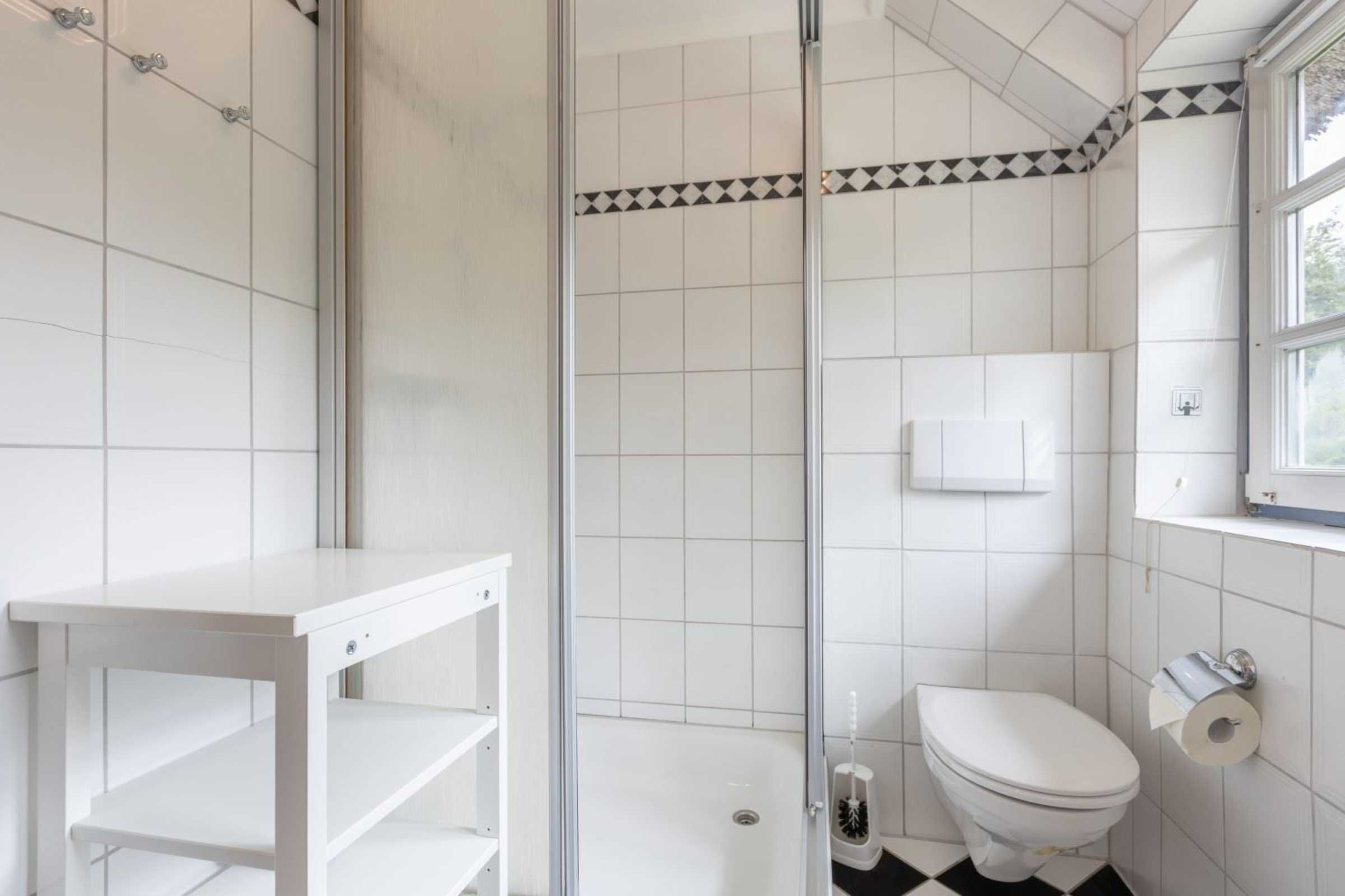 Badezimmer (Duschbad) mit Dusche, WC, Tageslicht und Föhn.