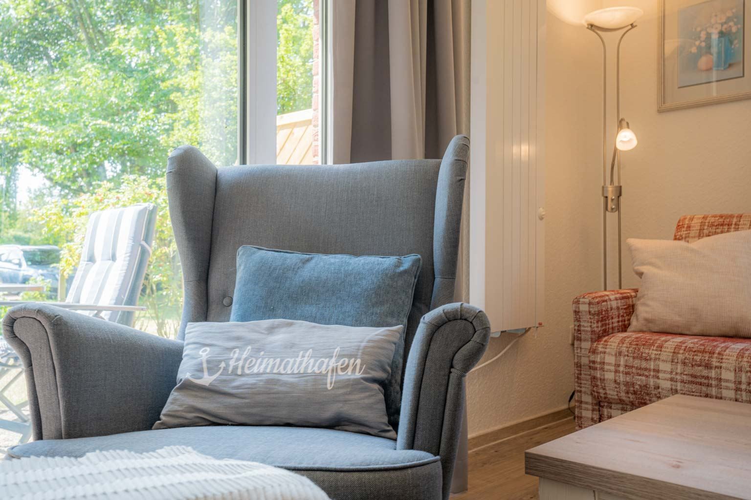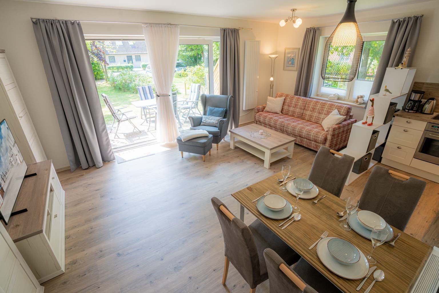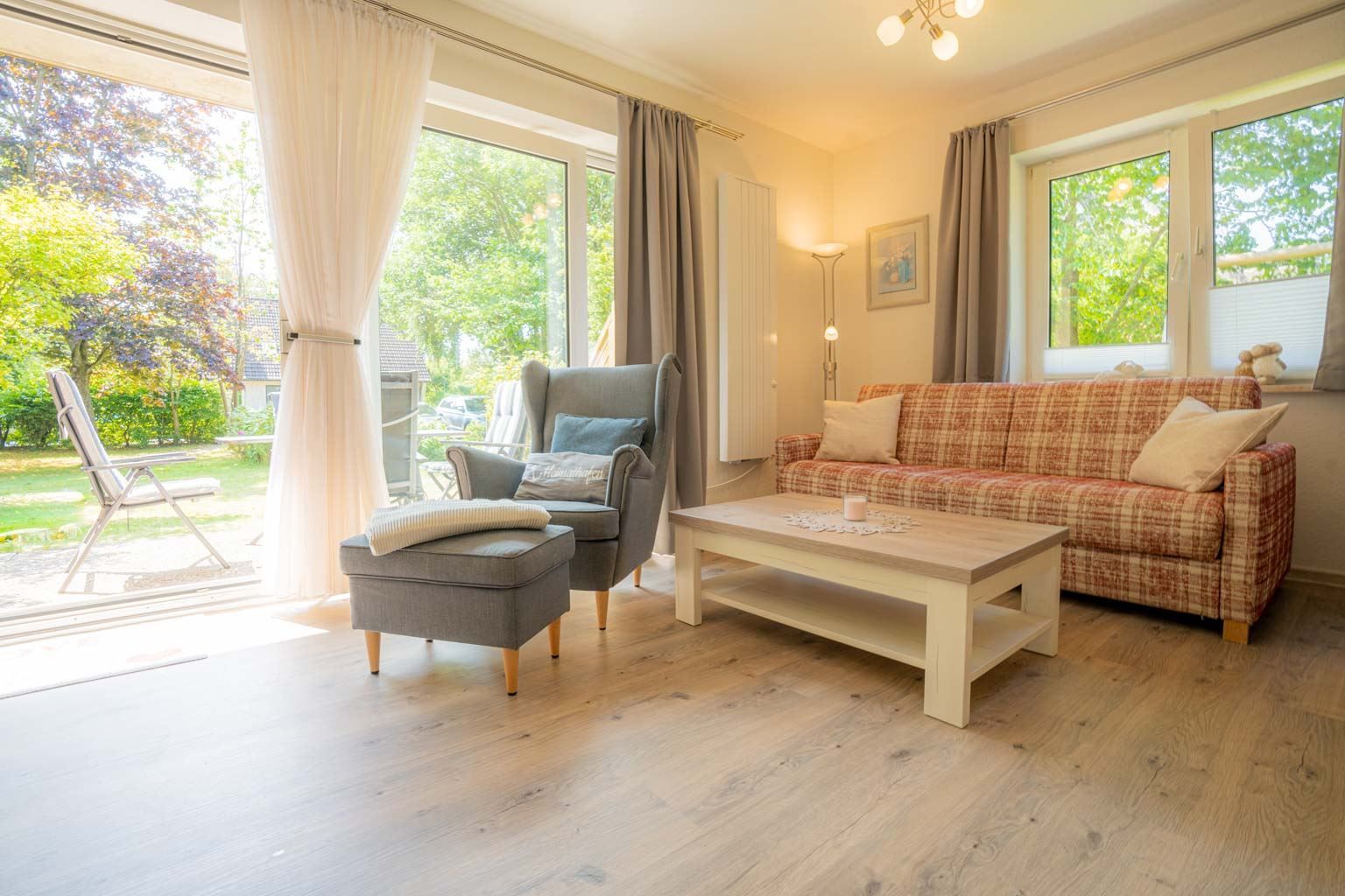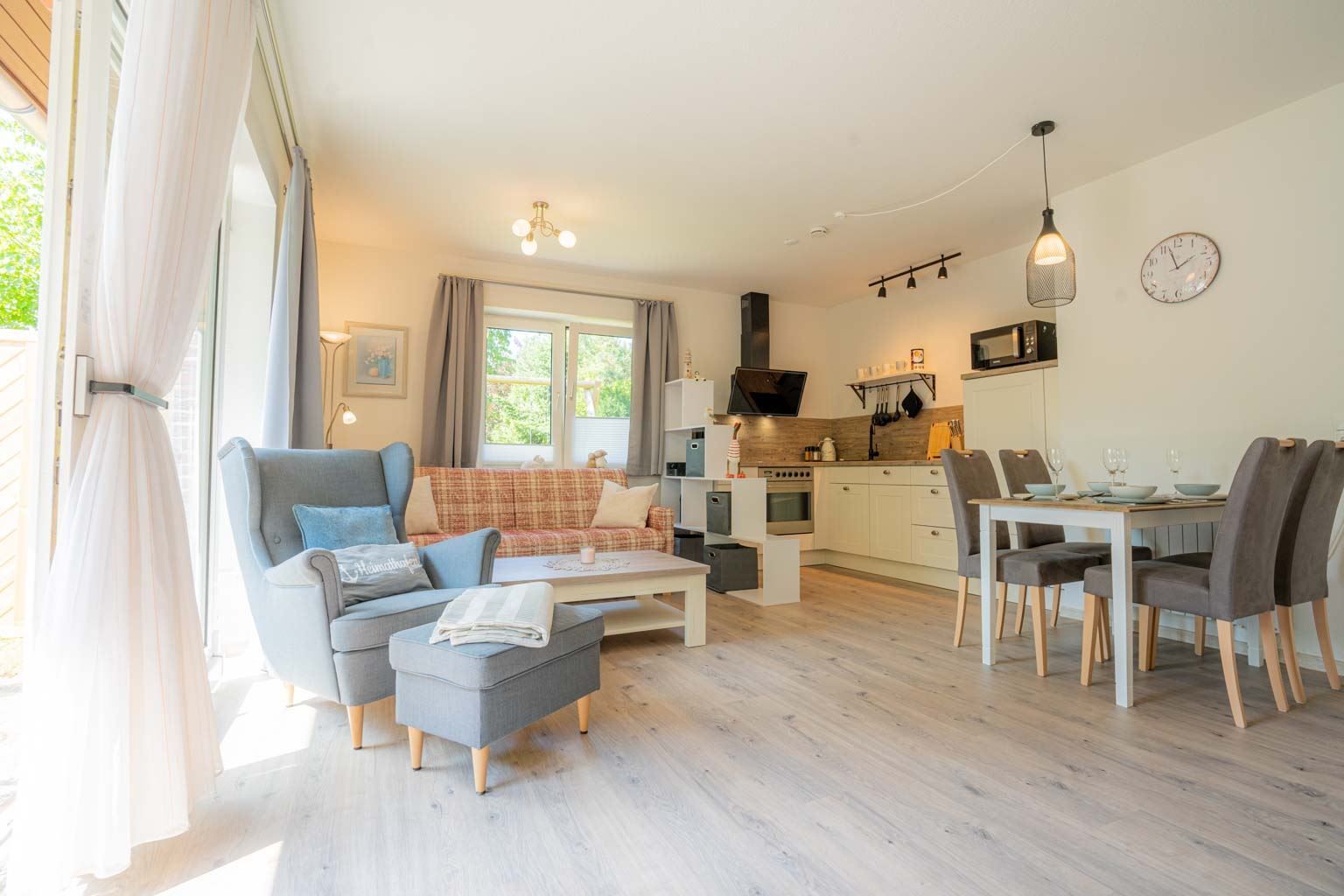 Wohnzimmer mit (ausklappbarem Schlaf-) Sofa (160x200cm), bequemem Ohrensessel mit Fußhocker, SMART-TV (Kabel), Bluetooth-Soundanlage mit CD-Player und Esstisch mit 4 Stühlen. Direkter Zugang zur möblierten Gartenterrasse nach Süden. Halboffene Küche mit Backofen, Mikrowelle, Geschirrspülmaschine und Kühlschrank mit Gefrierfach.