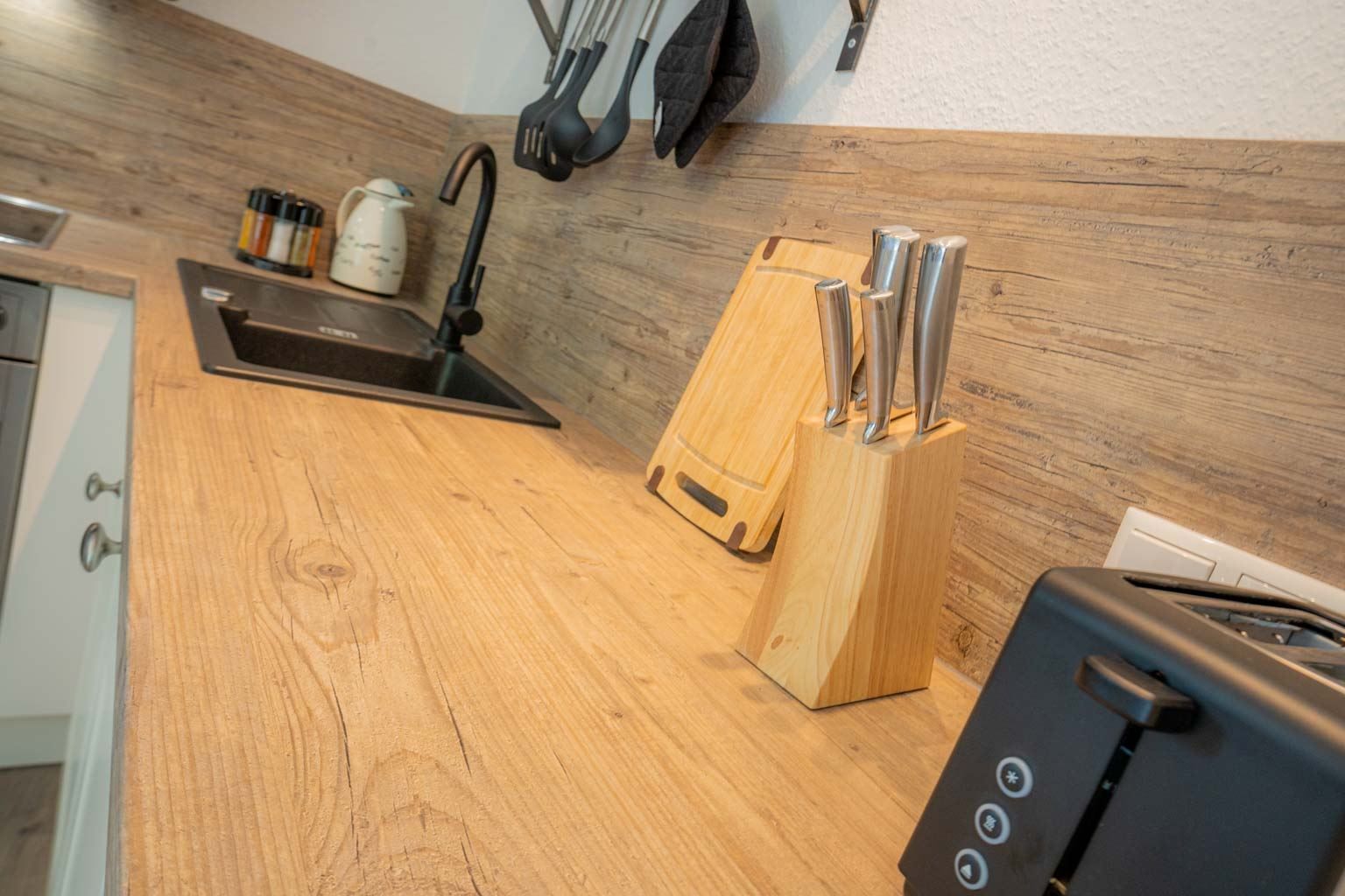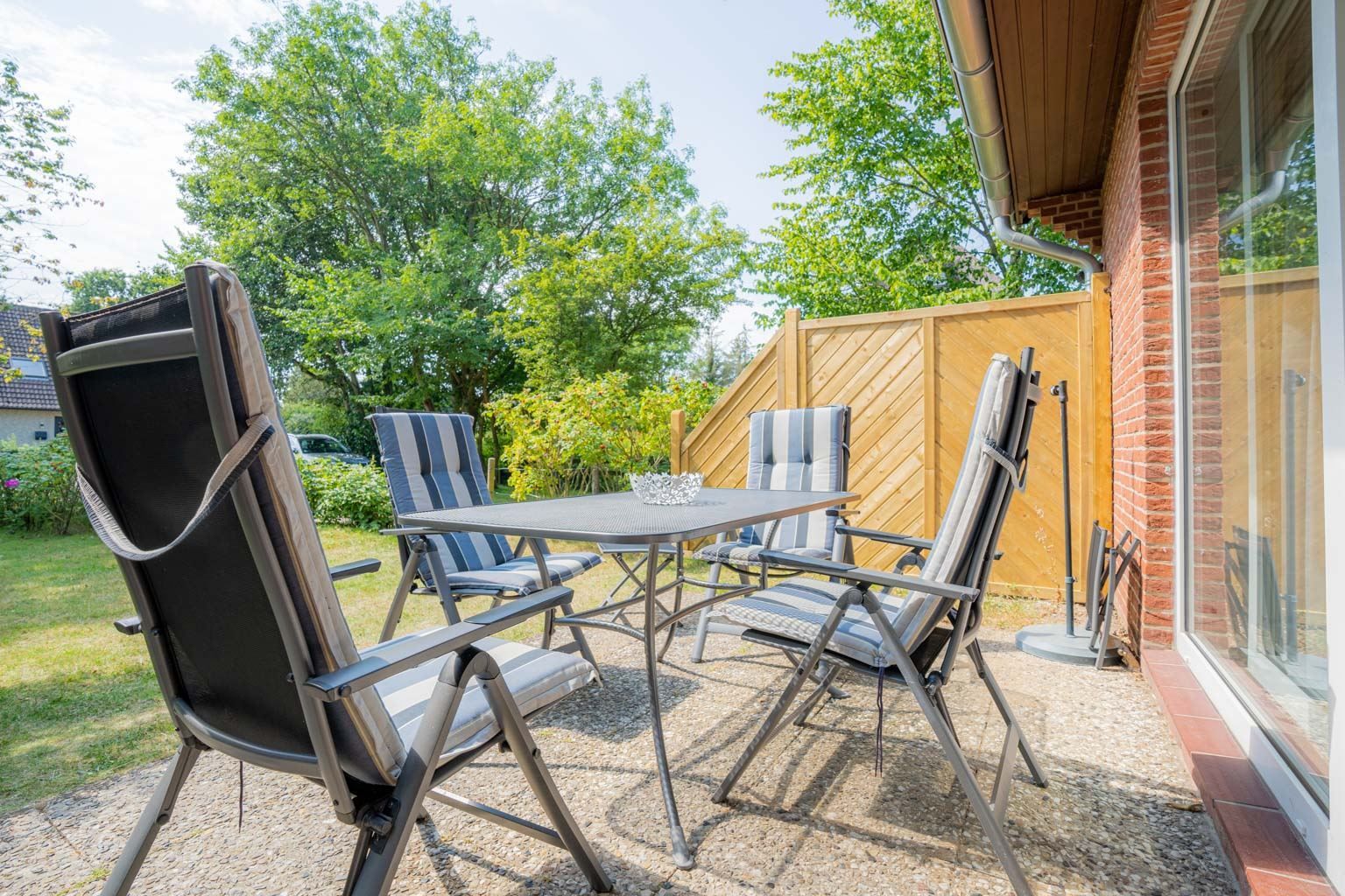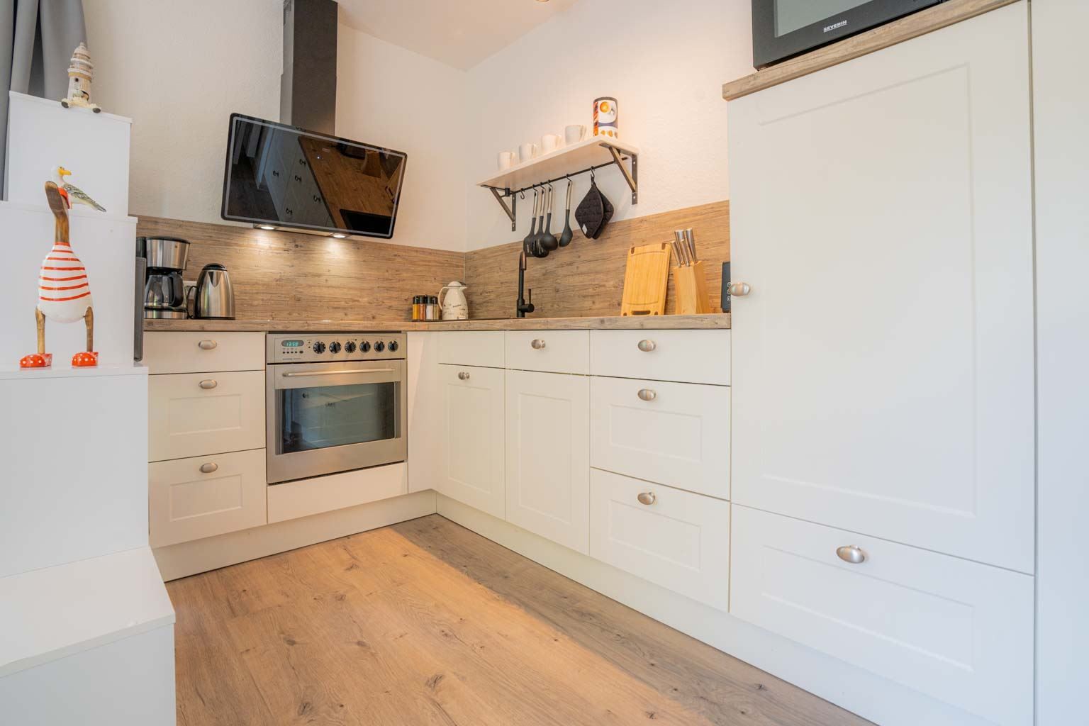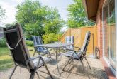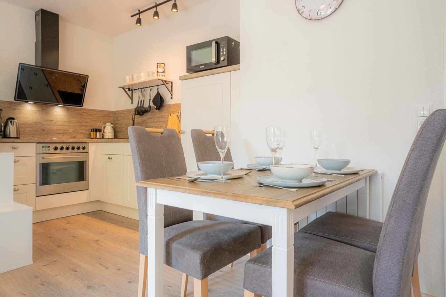 Wohnzimmer mit (ausklappbarem Schlaf-) Sofa (160x200cm), bequemem Ohrensessel mit Fußhocker, SMART-TV (Kabel), Bluetooth-Soundanlage mit CD-Player und Esstisch mit 4 Stühlen. Direkter Zugang zur möblierten Gartenterrasse nach Süden. Halboffene Küche mit Backofen, Mikrowelle, Geschirrspülmaschine und Kühlschrank mit Gefrierfach.