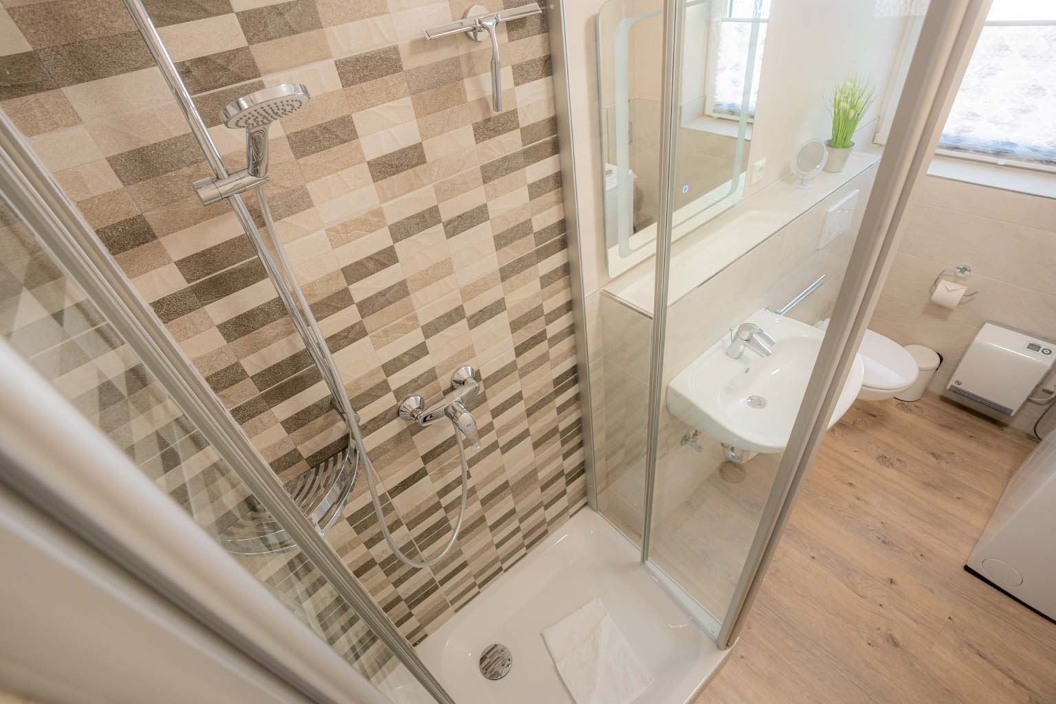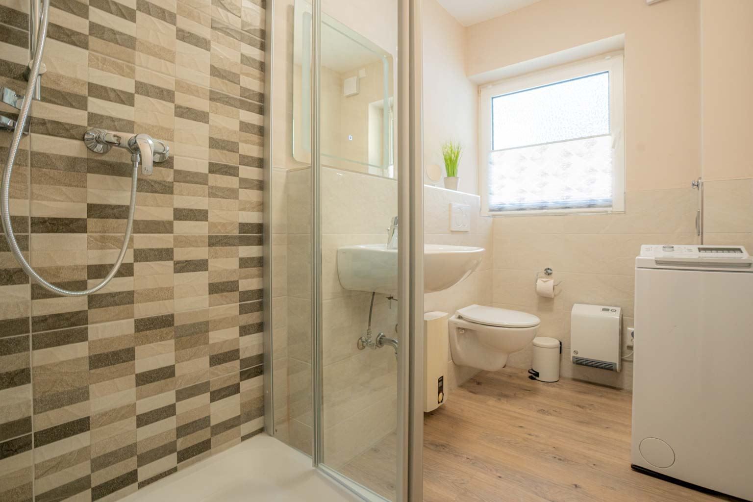 Badezimmer (Duschbad) mit Dusche, WC, Waschmaschine (TopLoader), Föhn und Tageslicht.
