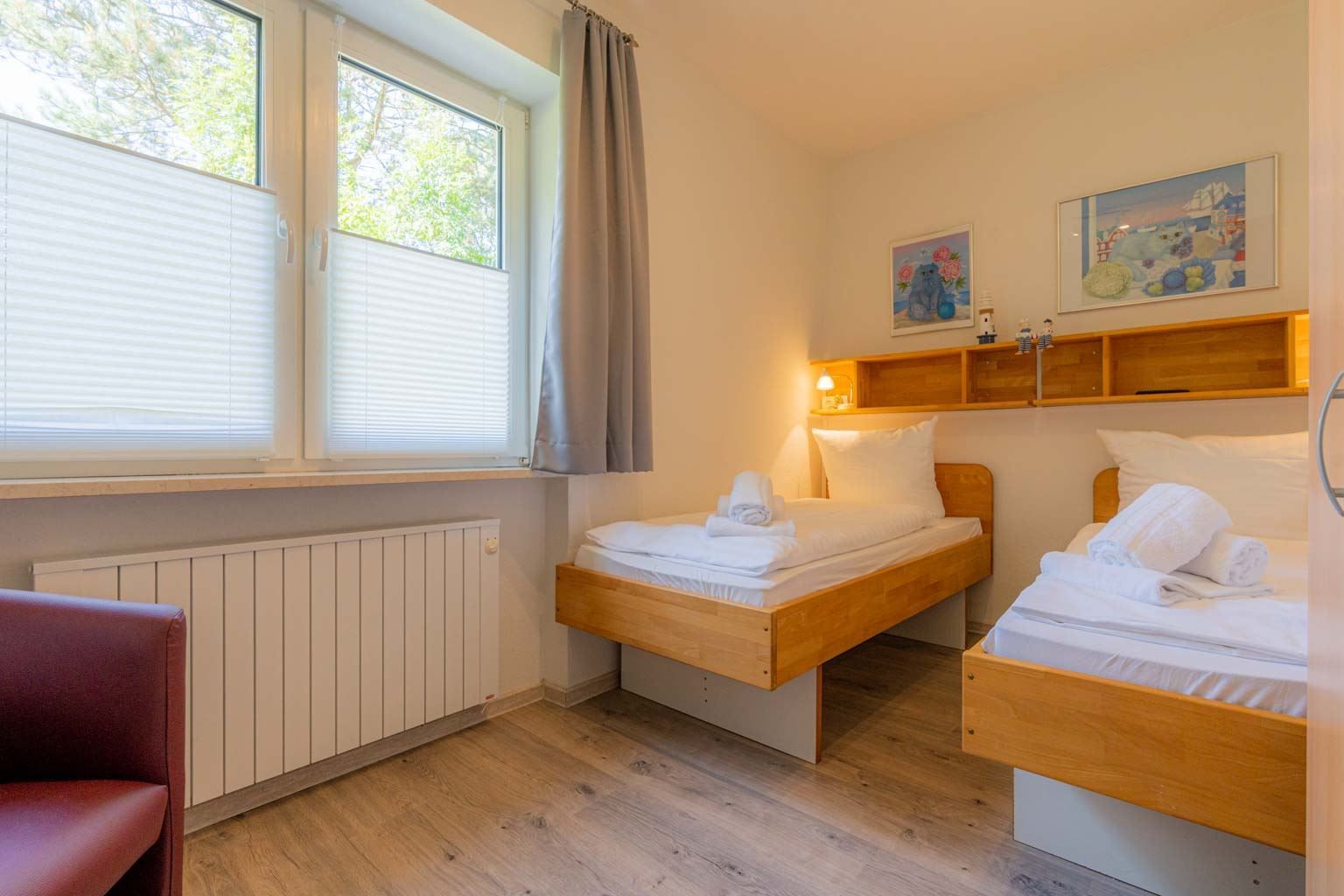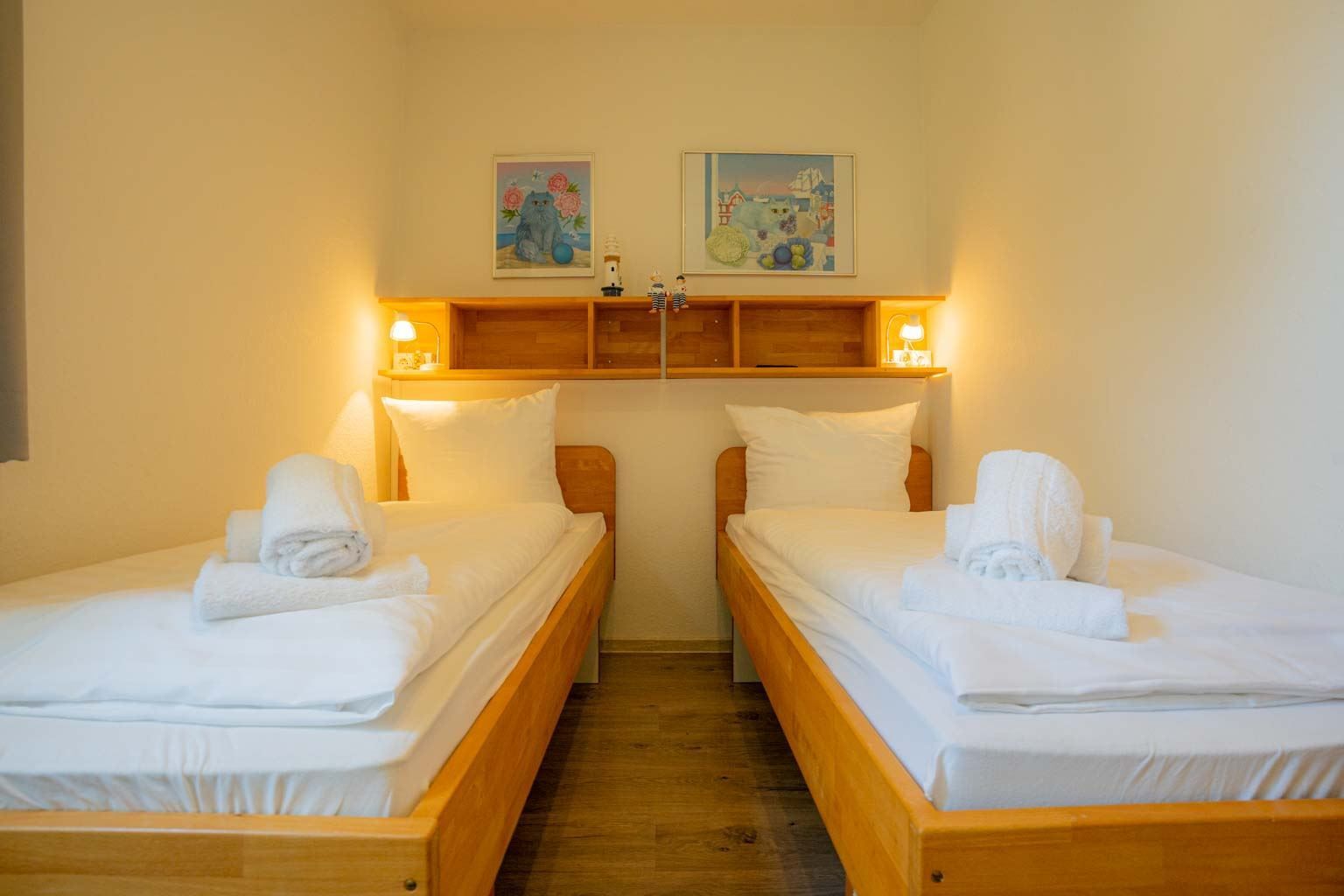 Schlafzimmer mit 2 Einzelbetten (je 90x200cm), kleinem Kleiderschrank und SMART-TV (Kabel).