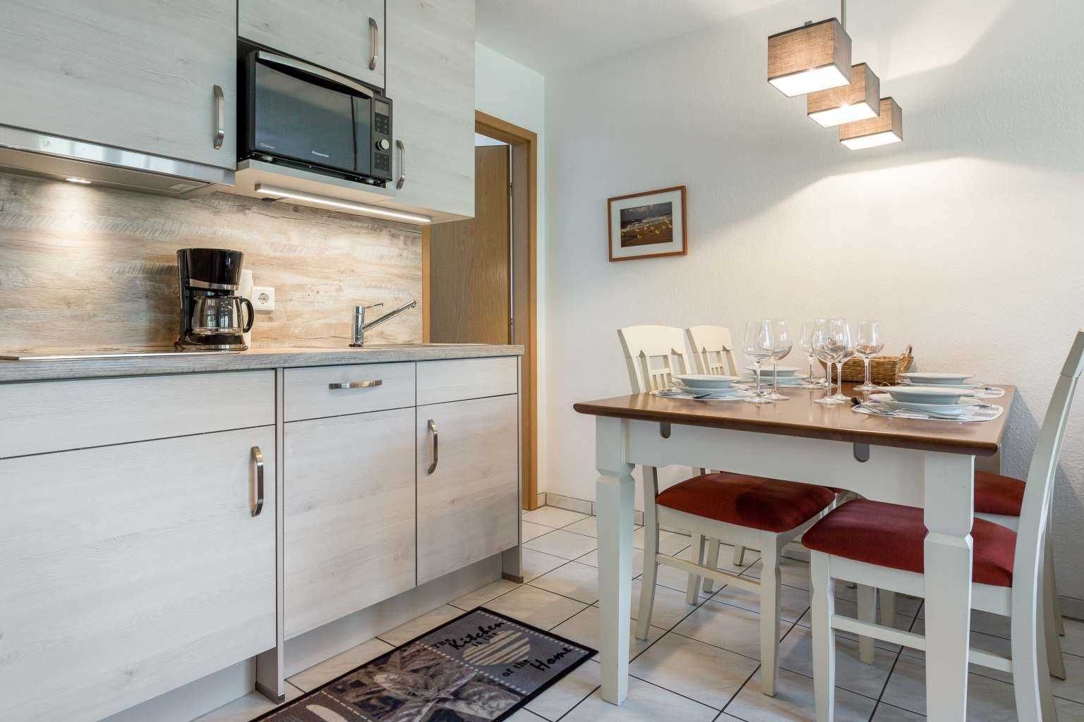 Wohnzimmer mit Sofa (2er), 2 Sesseln, kleinem TV (Kabel) und Esstisch mit 4 Stühlen. Offene Küche mit Herd mit 3 Kochstellen, Mikrowelle, Geschirrspüler und Kühlschrank mit Gefrierfach.