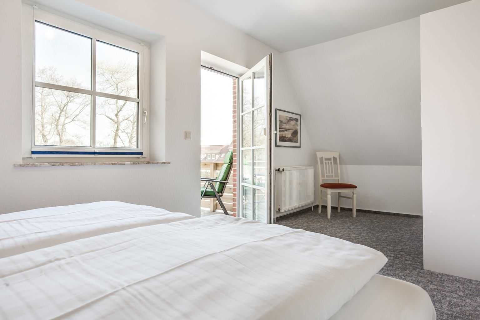 1. Schlafzimmer mit Doppelbett (2x 80x200cm), Kleiderschrank, Kommode und 2 Stühlen. Direkter Zugang zum Balkon nach Norden.