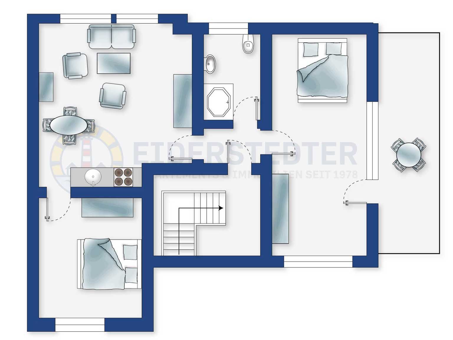 Komfortable 3-Zimmer-Ferienwohnung im Haus Paulsen mit ca. 43 qm auf 1 Ebene (OG) für bis zu 4 Personen. Zentrumsnahe Lage im Ortsteil Dorf in St. Peter-Ording. Zu den Geschäften und Restaurants der Dorfstraße sind es nur wenige Gehminute. Den Strand erreichen Sie ebenfalls in wenigen Minuten zu Fuß. Die Reithalle ist in direkter Nachbarschaft.