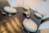 Wohnzimmer mit 2 Sofas (3er und 2er), Esstisch mit 5 Stühlen, TV (Kabel) und DVD-Player. Direkter Zugang zum möblierten Balkon.