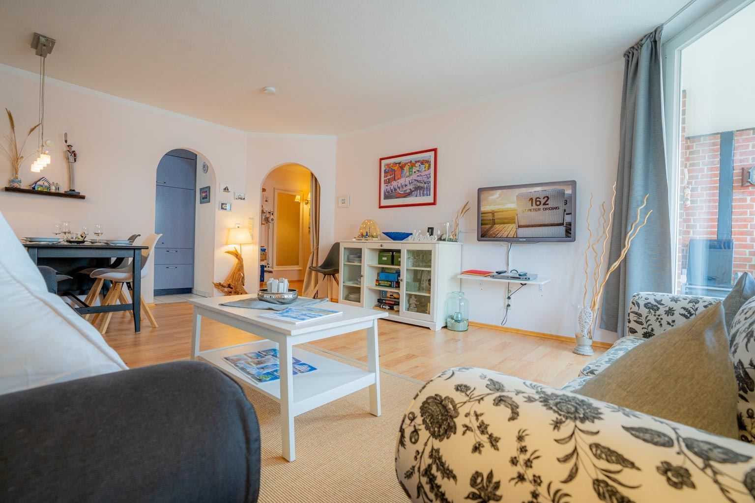 Strandnahe 2-Zimmer-Ferienwohnung mit ca. 45 qm auf 1 Ebene (2. OG) für bis 2 Personen. Zentrale Lage im Ortsteil Bad in St. Peter-Ording. Zur Promenade, dem Strand, der Dünentherme und allen Restaurants und Geschäften des Kurzentrums sind es nur wenige Gehminuten. Mit großem Balkon.