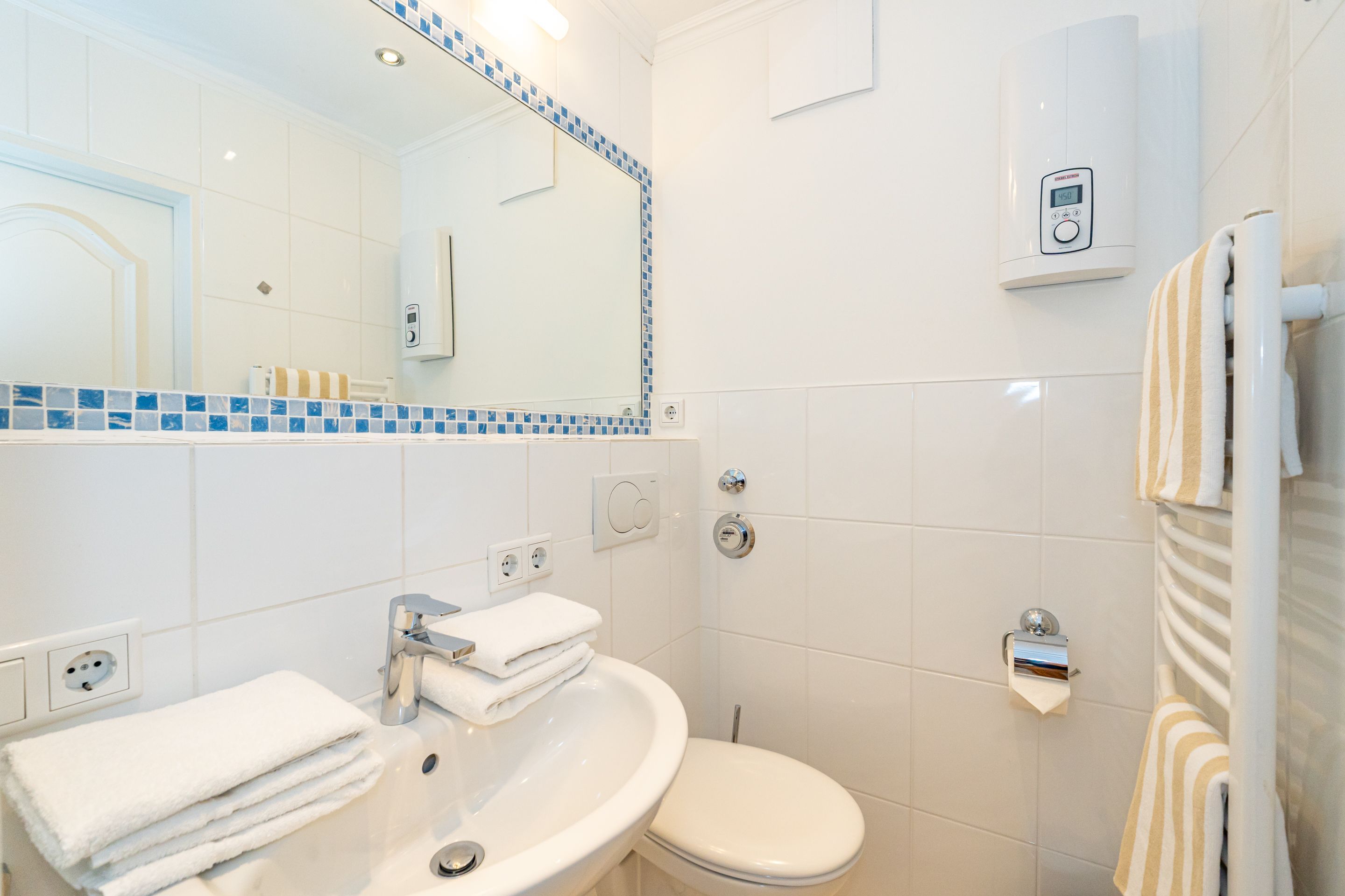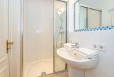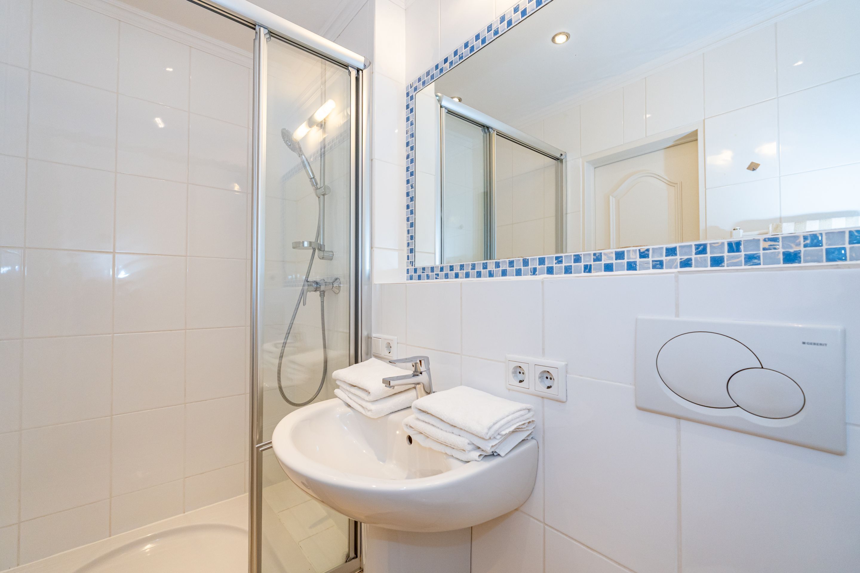 Im neuen Bad befinden sich eine Dusche, ein WC, ein Waschtisch und ein Handtuchtrockner.