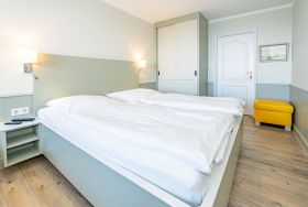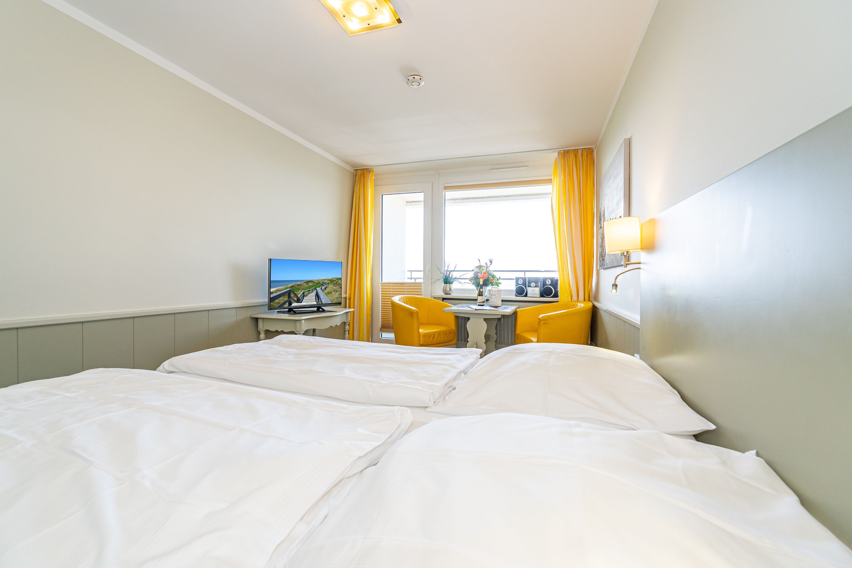 Der Wohn-/Schlafraum besteht aus einem feststehendem Doppelbett, zwei Sesseln, Flachbild-TV, Radio-CD.