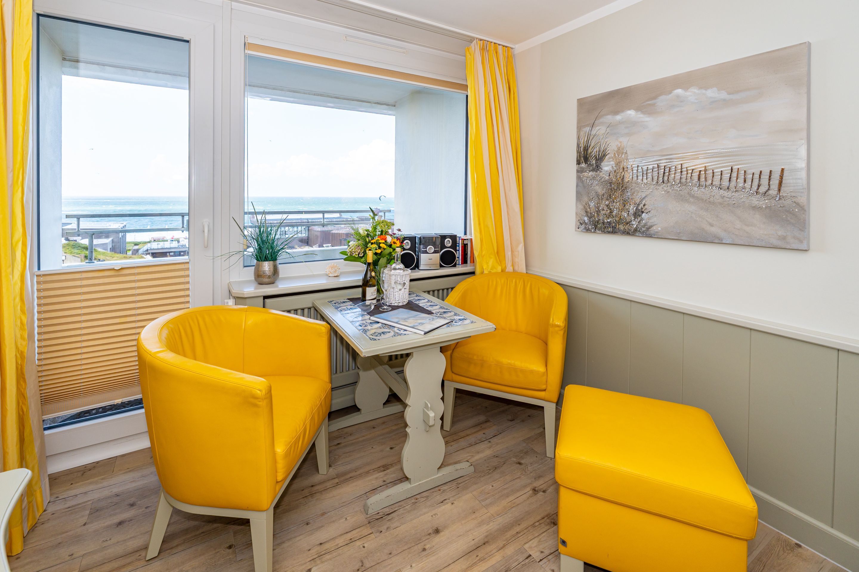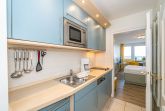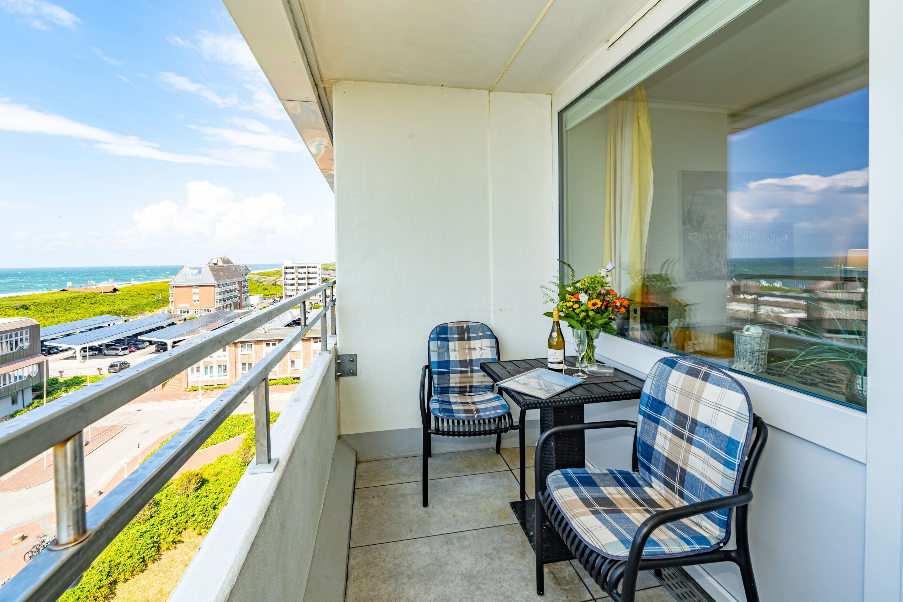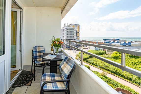Individuell gestaltete 1-Zimmer-Nichtraucher-Ferienwohnung (ca. 25 qm) in der 6. Etage (letzte Etage zu Fuß) zur Seeseite mit Westloggia und herrlichem Meerblick, (Nachmittagssonne mit Balkonmöbeln und Auflagen) für max. 2 Personen.