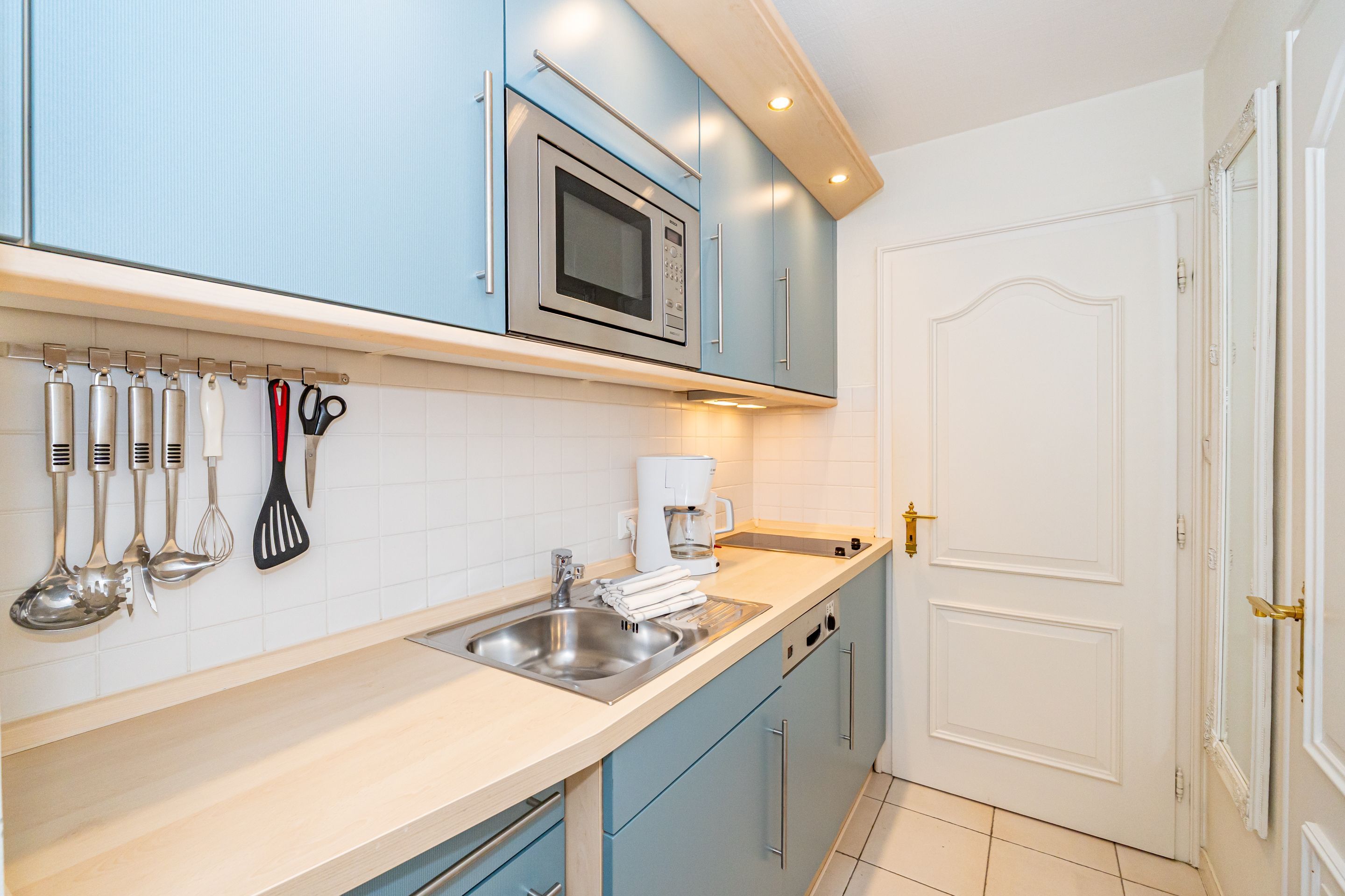 Die moderne Küchenzeile hat einen Geschirrspüler, eine Nespresso-Maschine, ein Cerankochfeld, eine Mikrowelle mit Grillfunktion und einen Kühlschrank mit 3*-Gefrierfach. Kaffeemaschine, Wasserkocher und Toaster gehören zur Grundausstattung.
