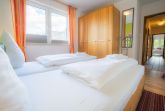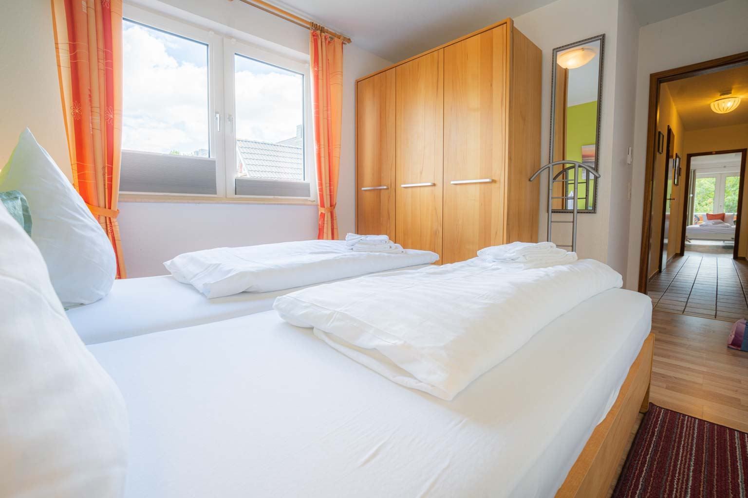 Schlafzimmer mit Doppelbett (2x90x200cm), Kleiderschrank und Stuhl.