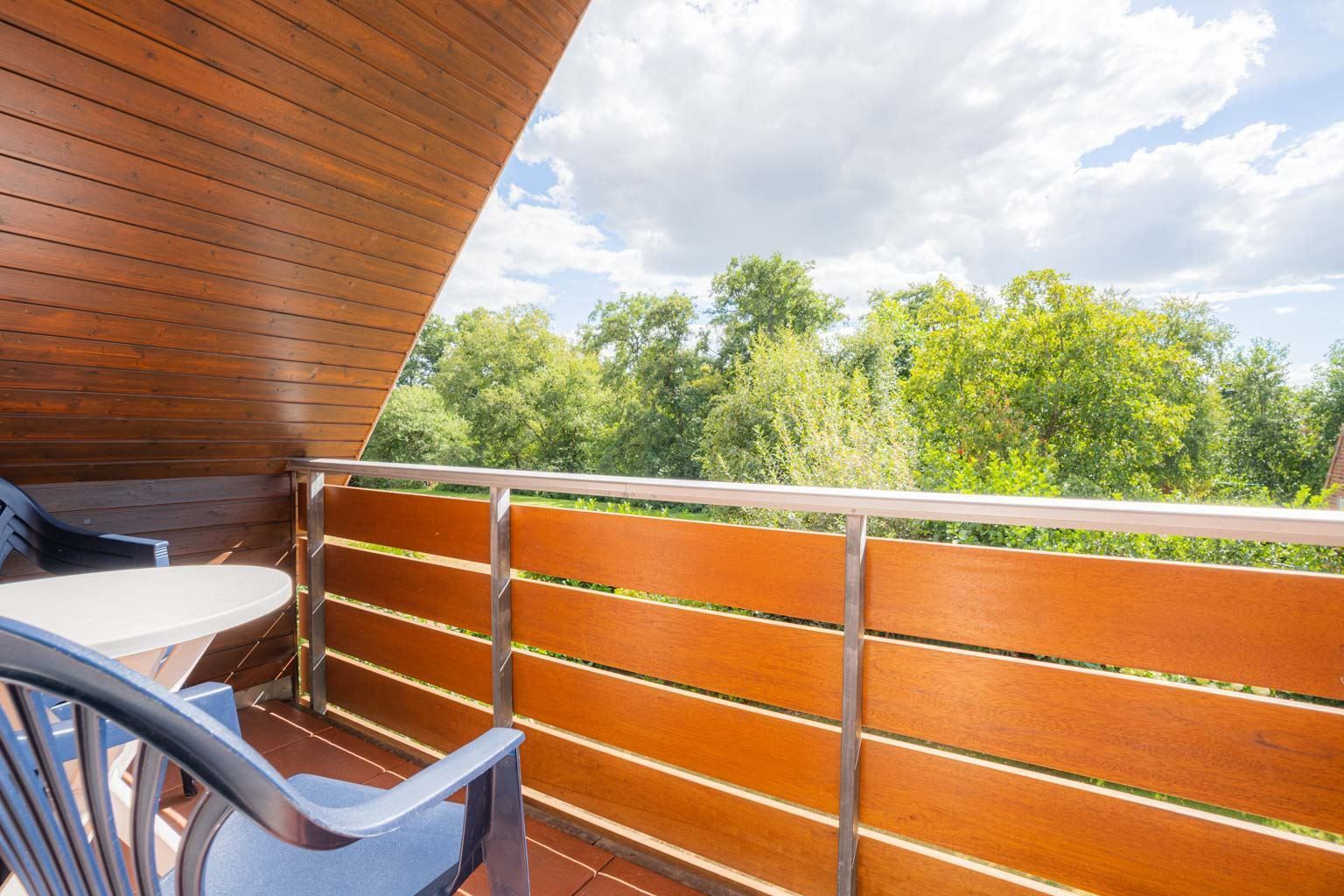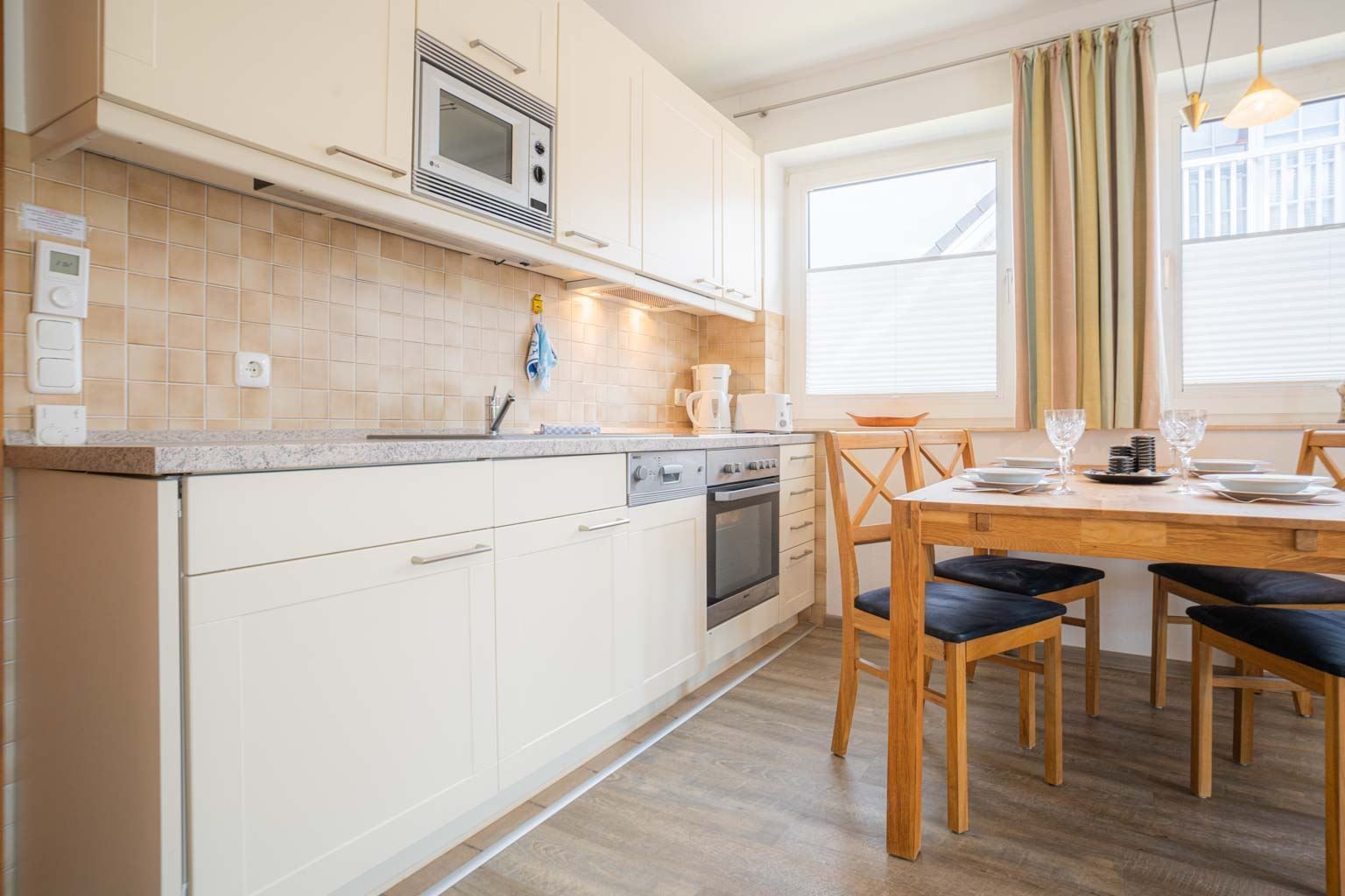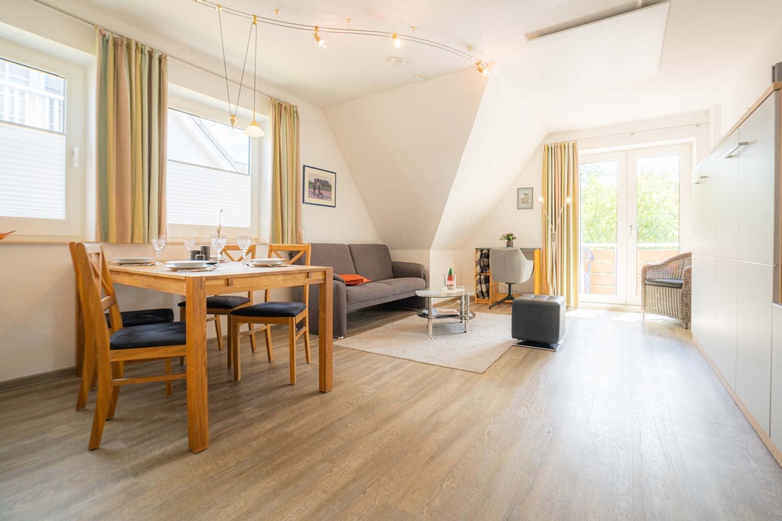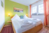 Wohn-/Schlafzimmer mit ausklappbarem Schrank-Doppelbett (2x 70x190cm), Sofa (2er), Sessel, TV (Sat), Radio mit CD-Player und Esstisch für 4 Personen. Direkter Zugang zum möblierten Balkon nach Südosten. Offene Küche mit Backofen, Mikrowelle, Geschirrspüler und Kühlschrank mit Eisfach.