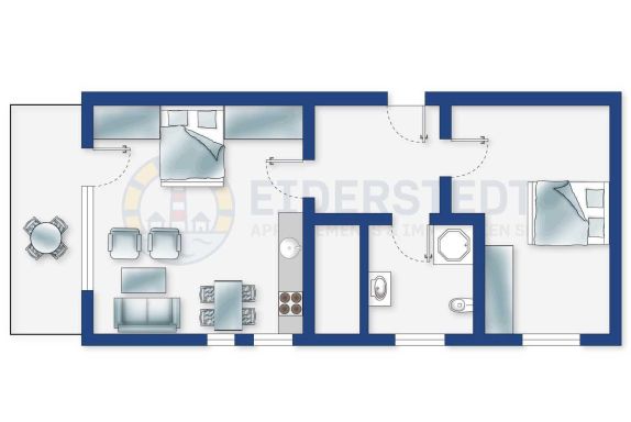 Gemütliche 2-Zimmer-Ferienwohnung im Haus Dünenblick mit ca. 47 qm auf 1 Ebene (OG) für bis zu 4 Personen. In ruhiger Lage im Ortsteil Dorf in St. Peter-Ording. Der Deich und der Strand sind in wenigen Gehminuten erreichbar.