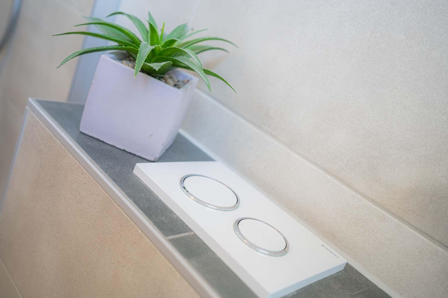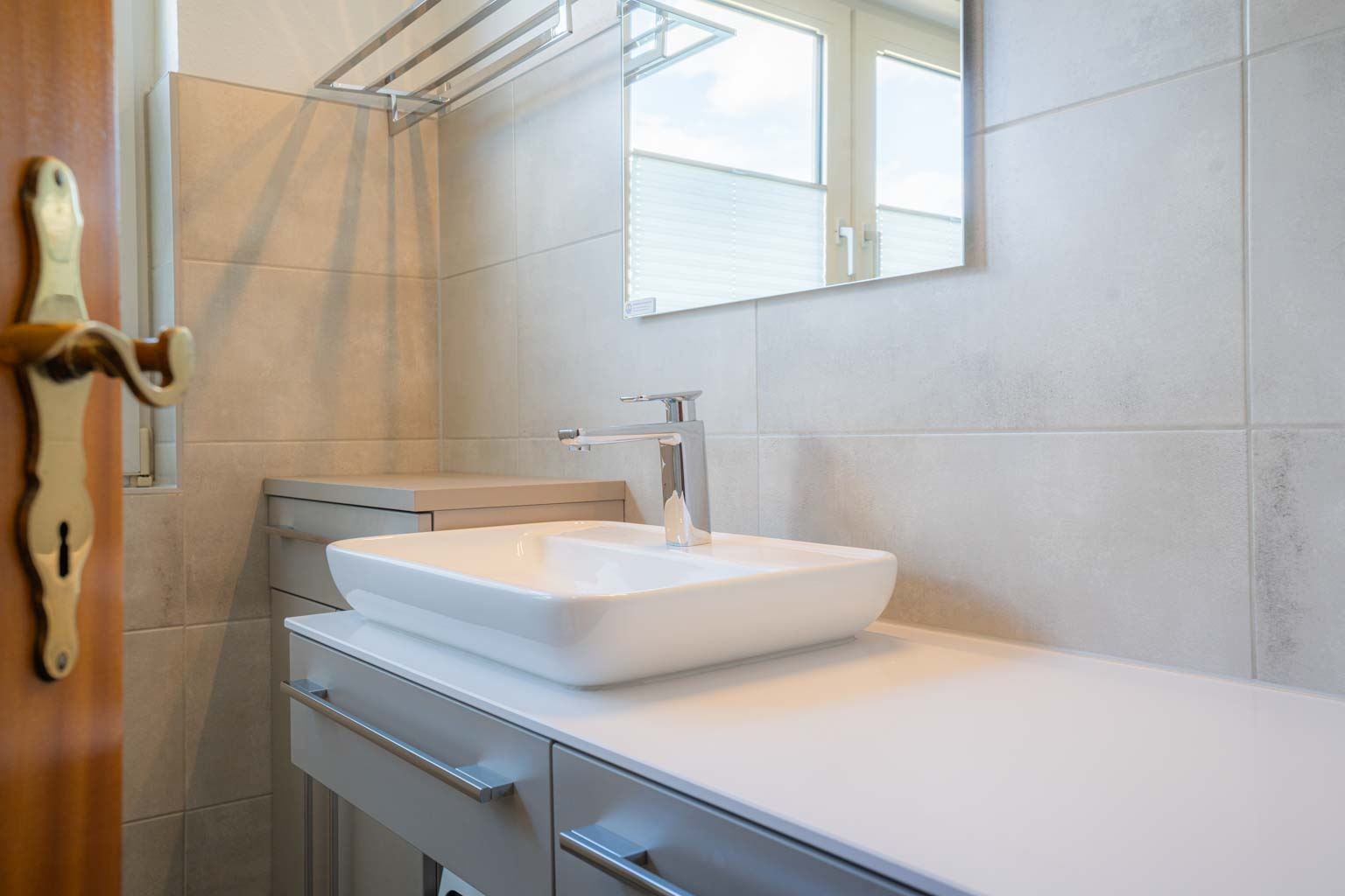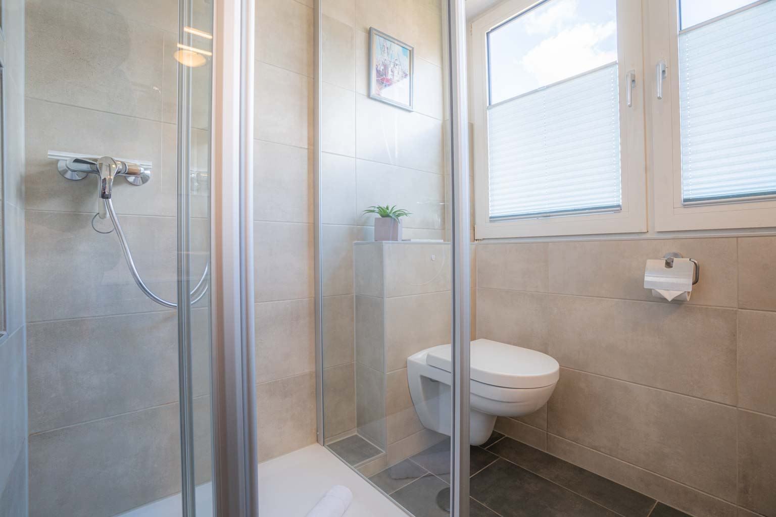 Badezimmer (Duschbad) mit Dusche (niedriger Einstieg), WC und Tageslicht. Kein Föhn.