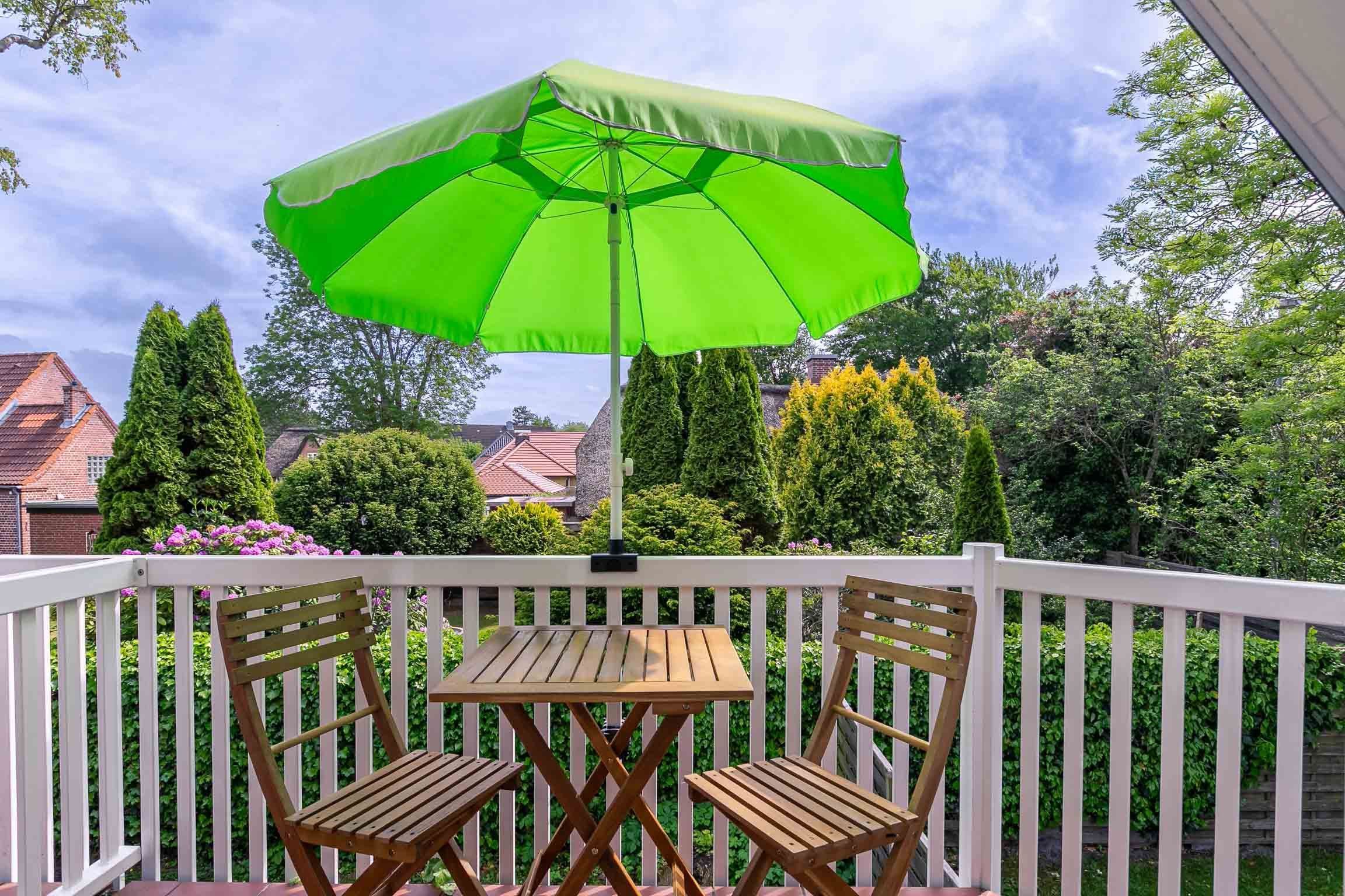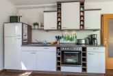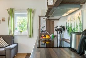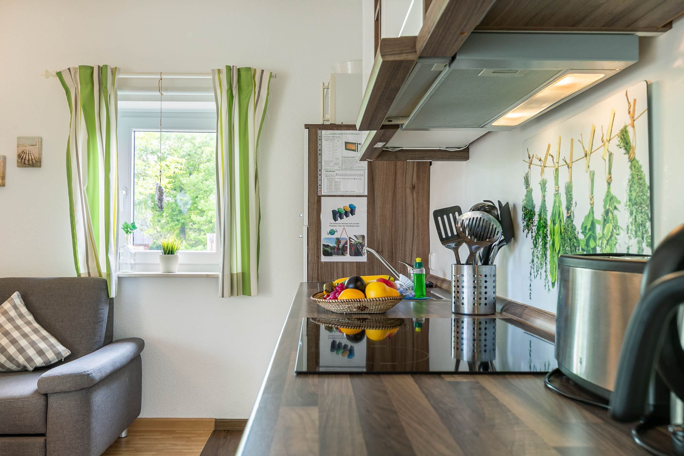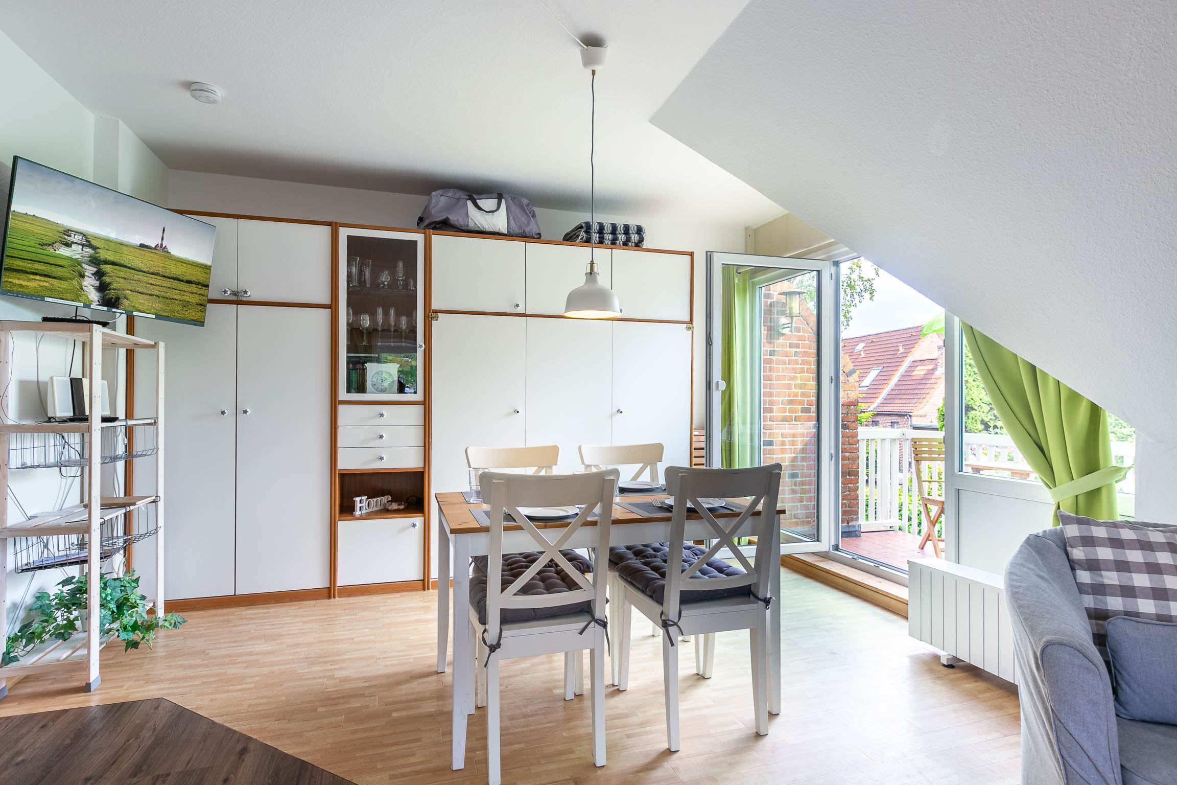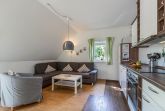 Wohnzimmer mit Ecksofa (bis zu 5 Personen), Schrank-Doppelbett (2x 80x200cm), Sessel, großem TV (Kabel), Stereoanlage und Esstisch mit 4 Stühlen. Direkter Zugang zum möblierten Balkon nach Süden mit Blick auf grüne Gärten und prächtige Reetdachhäuser. Offene Küche mit Backofen, Mikrowelle, Kühlschrank, separatem Gefrierschrank und Geschirrspüler.